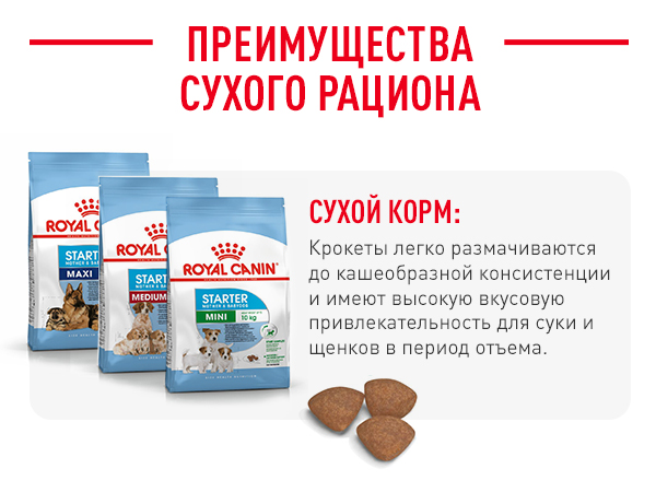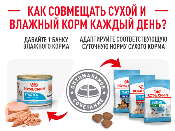 Вологий раціон Royal Canin Mother & Babydog розроблений для вагітних сук та новонародженних цуценят порід всіх розмірів віком до 2 місяців.