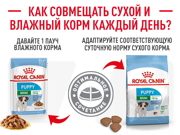 Вологий раціон ROYAL CANIN Puppy Mini розроблений для цуценят собак малих розмірів, вага яких у дорослому віці до 10 кг. Цуценята від 2 до 10 місяців.
