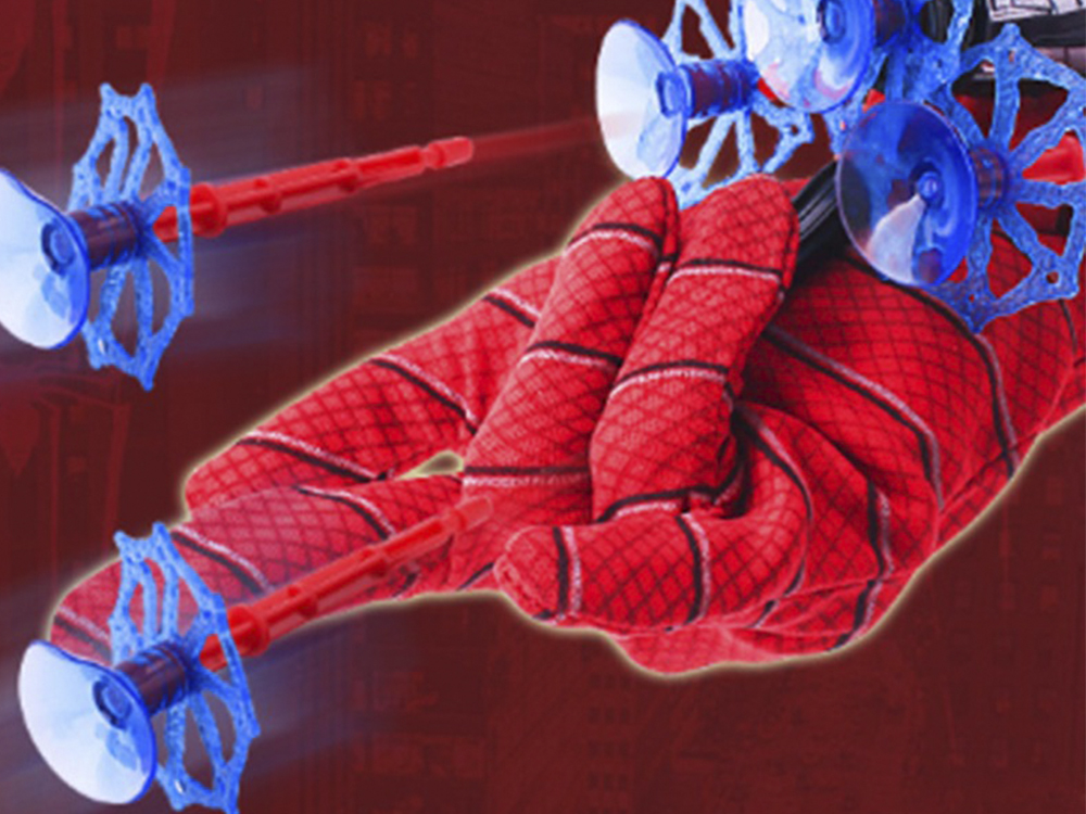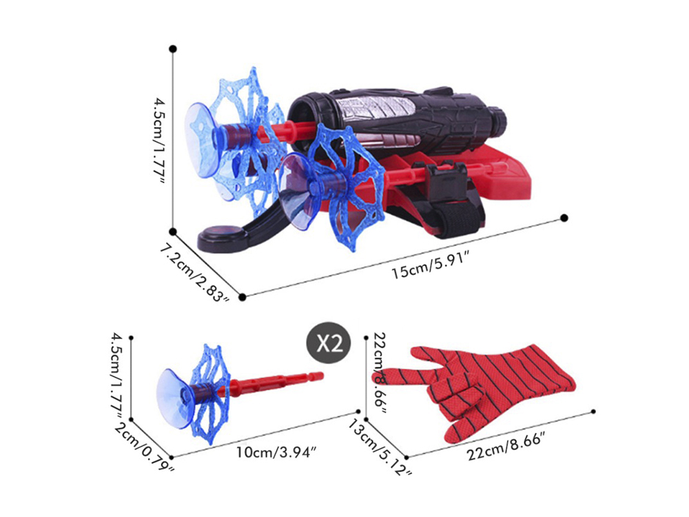 На верхній частині рукавички закріплений арбалет, який стріляє присосками. У наборі йде 3 присоски. Пістолет виконаний з міцного пластику.