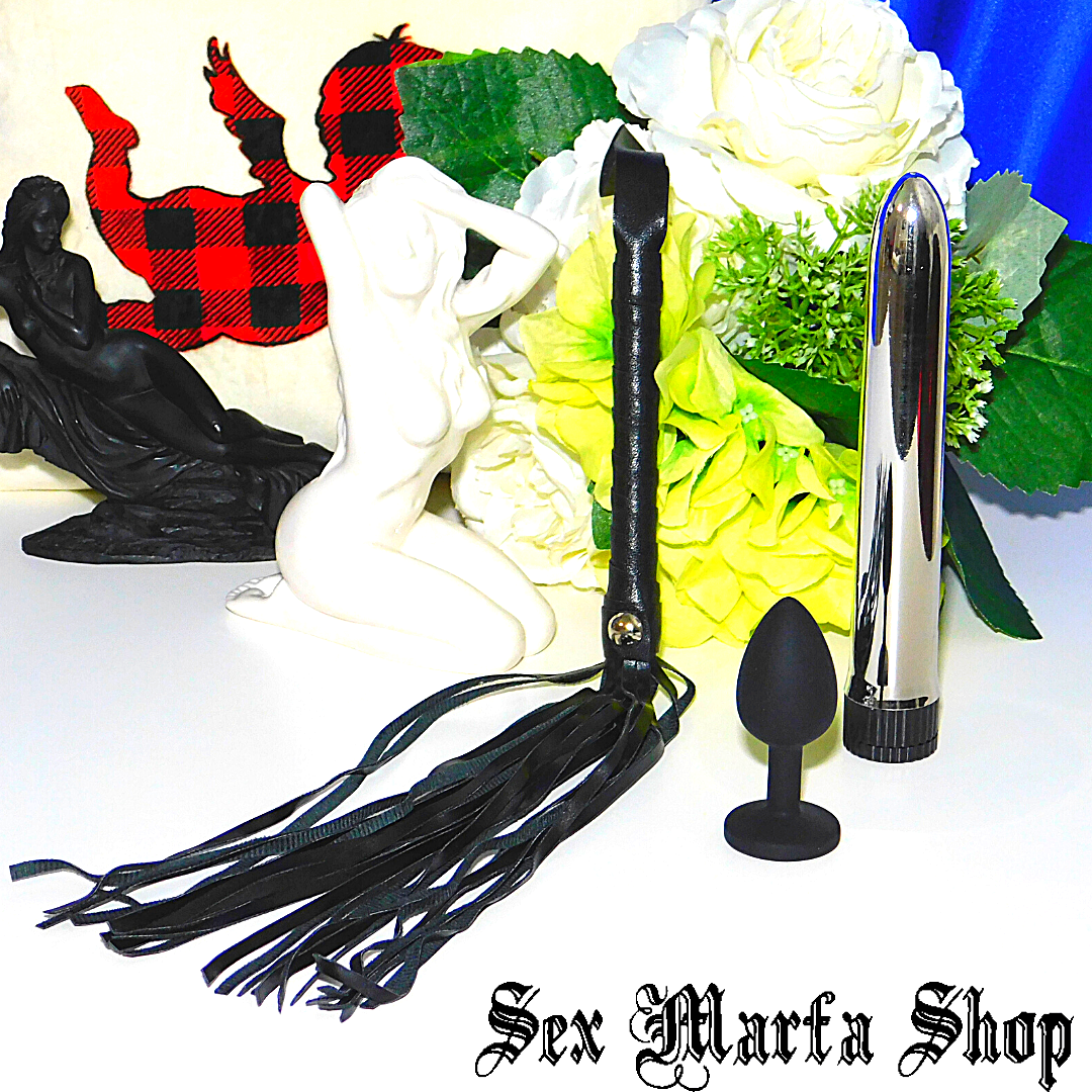 Секс Набор "Туман", 3 шт. Вибратор, анальная пробка со стразом, плетка, комплект для секса БДСМ, черный, MS2