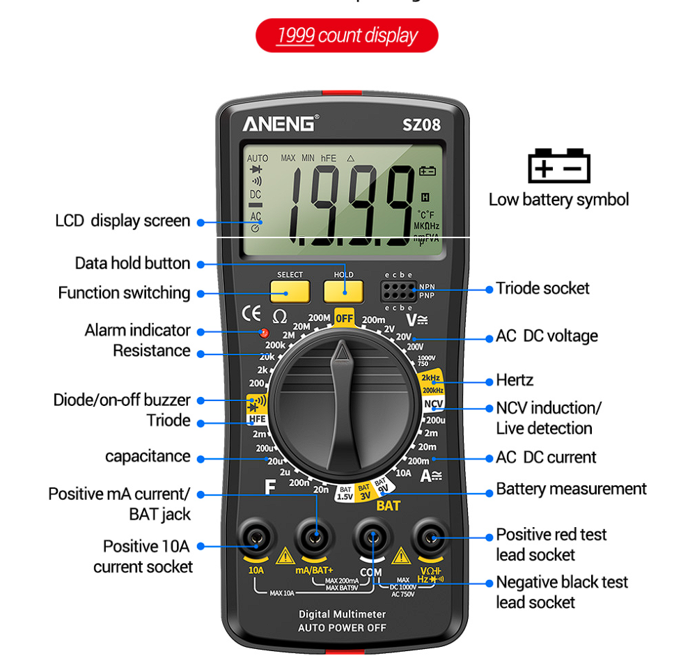 Описание : Цифровой мультиметр с NCV. Разрядность шкалы мультиметра:1999 отсчетов. Постоянное/переменное напряжение: 200mV(AC)2V/20V/200V/200mV/1000V(750AC). Постоянный/переменный ток: 200uA/2mA/20mA/200mA/10A. Cопротивление: 200/2K/20K/200K/2M/20M/200M, измерение ёмкости: 20nF/200nF/2uF/20uF/200uF/2mF. Измерение частоты: 2kHz/200kH. Тестирование батареек 1,5/3/9V, прозвонка соединений, тест диодов, удержание данных, звуковой сигнал. Питание: 2XAAA. Габариты: 179,5x80,3x15 (38мм м кейсом) мм