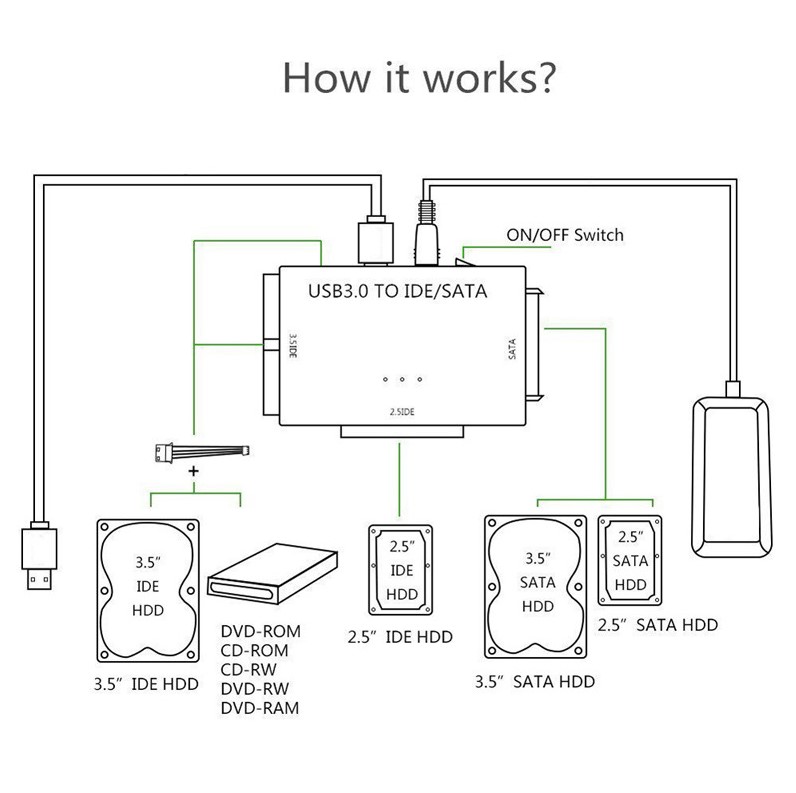 Адаптер переходник QGeeM для подключения SATA/IDE 2.5/IDE 3.5 к USB - это конвертер, который поможет Вам подключить SATA жёсткие диски, IDE 2.5 и IDE 3.5 к персональному компьютеру через разъем USB. Вы подключите носители информации на которых были кучи памятных фото, видео и другой информации.