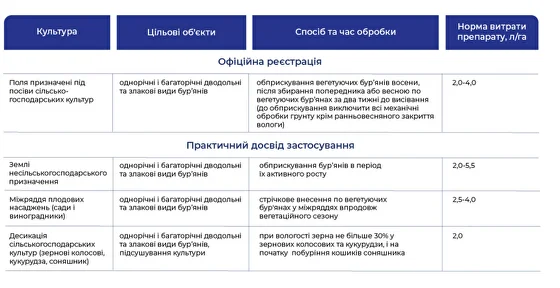 Обприскування рекомендовано проводити під час активної вегетації бур'янів.