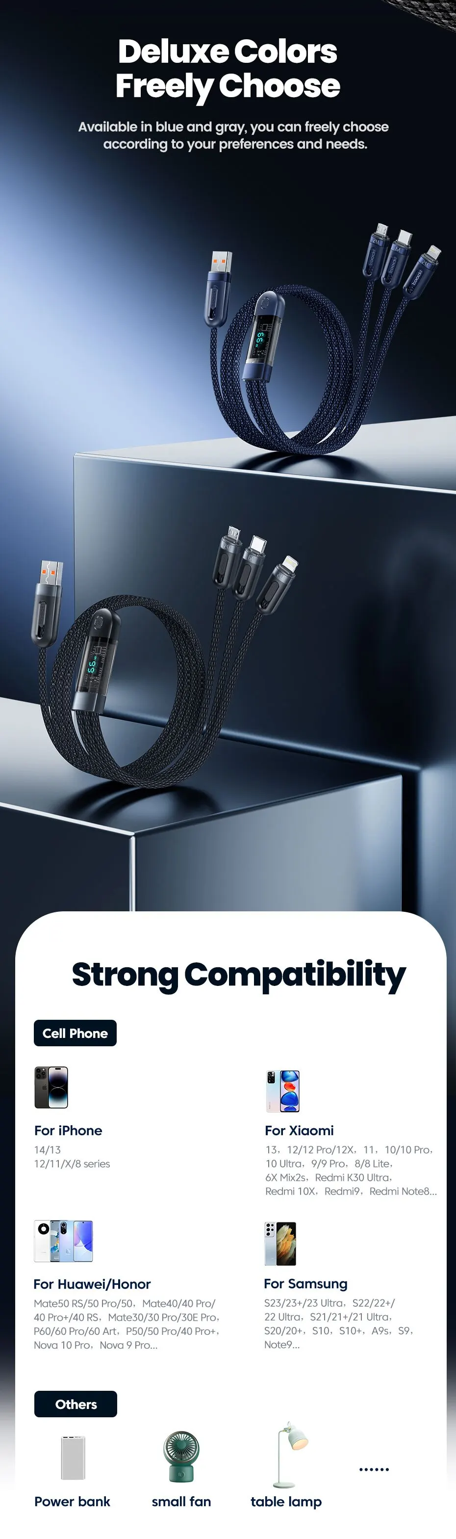 Прозрачный люминесцентный кабель для передачи данных для быстрой зарядки «три в одном» мощностью 100 Вт. Материал: тканый кабель для передачи данных. Вес: 75 г Цвет: Серый Интерфейс: USB Type-C, USB-iOS, USB-Android. Мощность: Type-C 66 Вт/4А, IOS -2.4А, Android- 2.4А