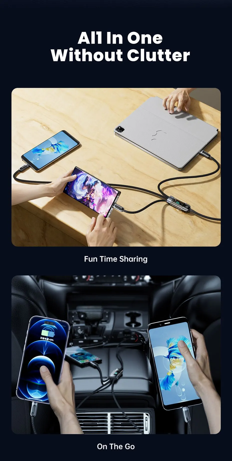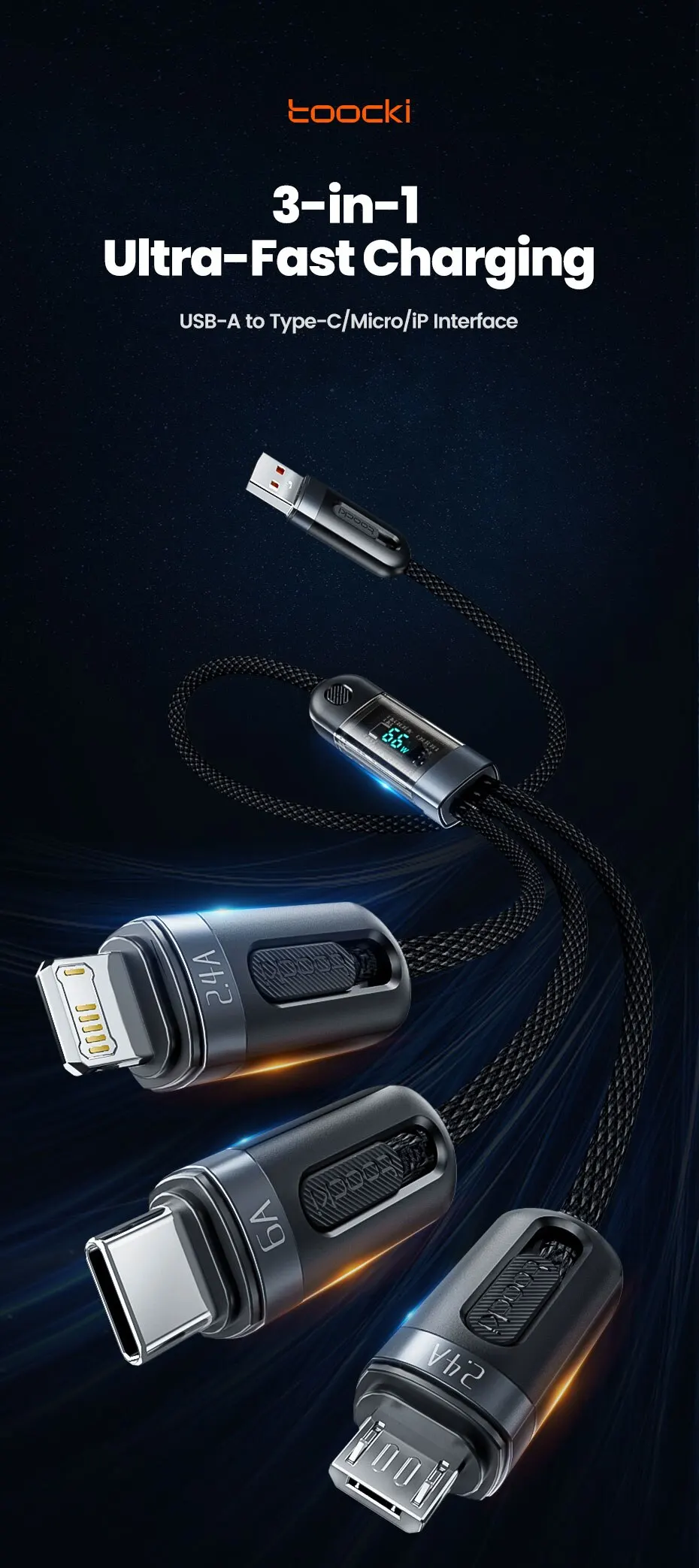 Кабель Toocki 100W 4A 3-in-1 для передачи данных и зарядки USB-A, Type-C, Lightning, Micro (1.2m) LED Дисплей