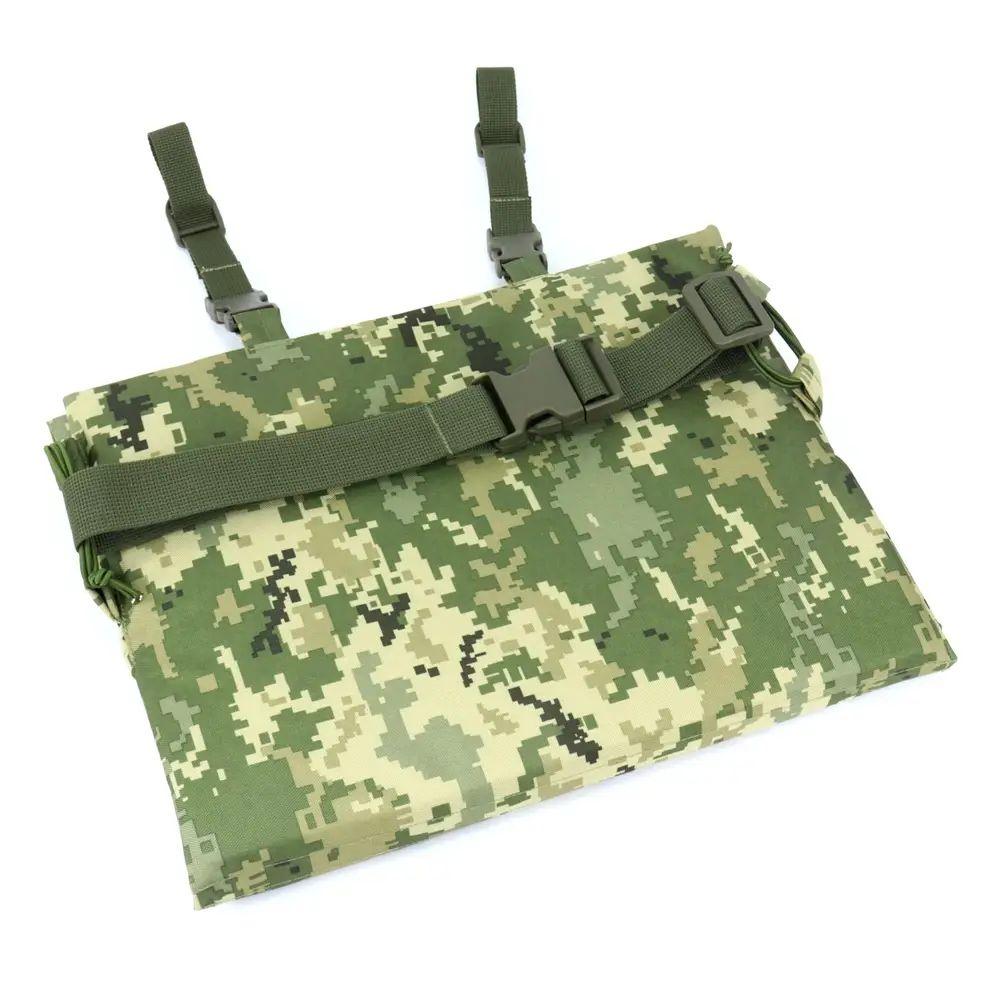 состоит из трех секций. Небольшие размеры и возможность использовать в трех различных положениях делает изделие чрезвычайно универсальным и незаменимым в полевых условиях. Оснащен креплениями как системы Molle на РПС или бронежилет, так и поясным, с возможностью их использования как вместе, так и по отдельности. Плотная ткань Оксфорд эффективно отталкивает воду, выдерживает различные агрессивные нагрузки, устойчива к износу. Наполнитель – изолон толщиной 10 мм, имеющий отличные теплоизоляционные свойства, что минимизирует риски переохлаждения, сидя на холодной земле или "броне". Почти не деформируется.