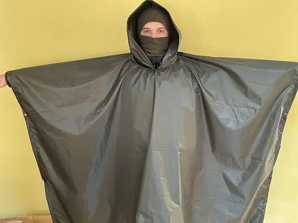 Дождевик можно использовать как палатку накрытия. По бокам имеет по три металлические кнопки. Также пришиты по углам шнурки для натяжения. 200см капюшон под каску на резинке под затяжку. Также к нему идет сумка, которая крепится на пояс или к системе молли. Ткань Состав: 100% пе.