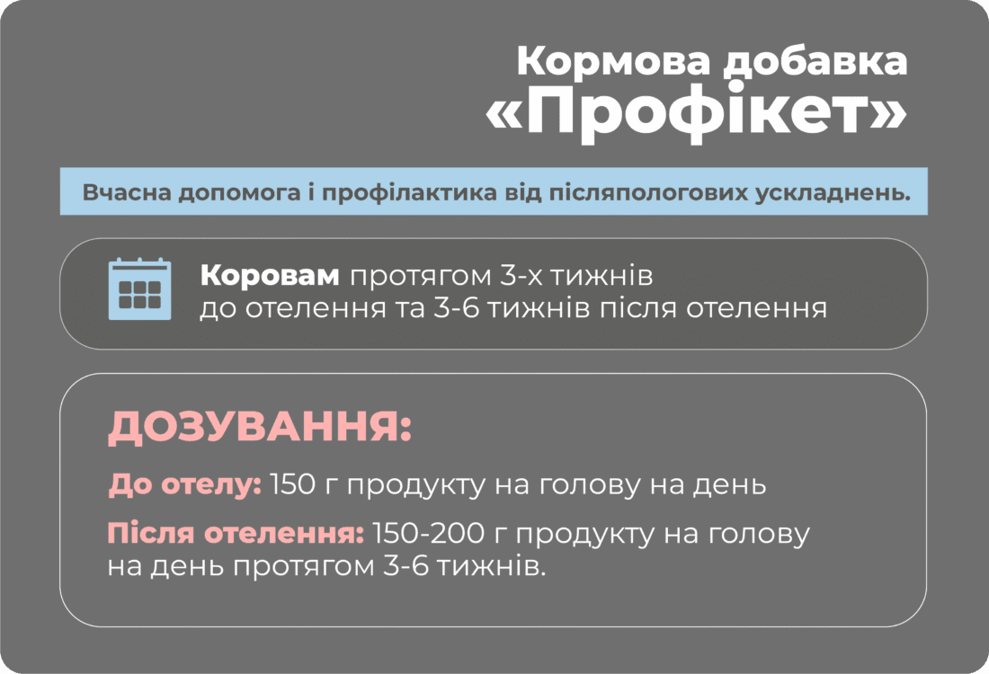 • Зменшення витрат на лікування: Використання «Профікету» дозволяє значно скоротити витрати на лікування післяпологових патологій у корів.