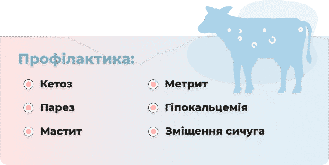 • Підвищення продуктивності: Добавка сприяє швидкому відновленню організму корови після отелення, що дозволяє максимально реалізувати її генетичний потенціал молочності.