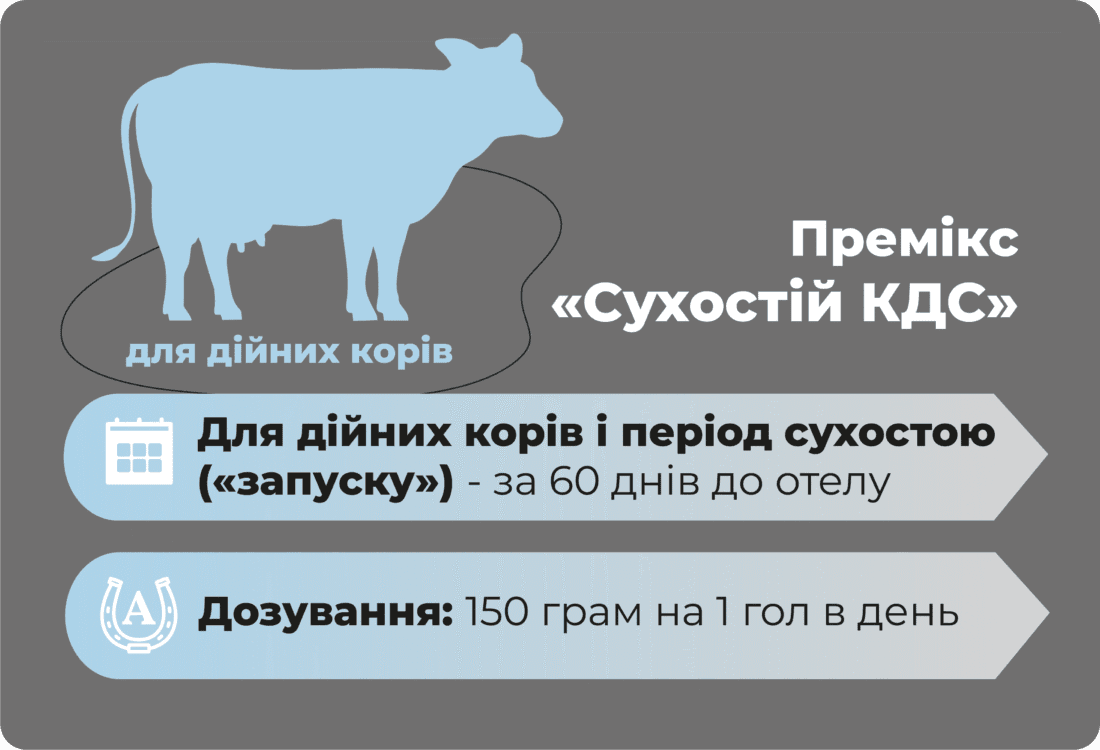 Потреба на 1 дійну голову в день: 150 грам Купуйте премікс «Сухостій КДС» від українського виробника «Анкорес» і переконайтеся в його ефективності самі! У складі преміксу всі необхідні мінерали і вітаміни.