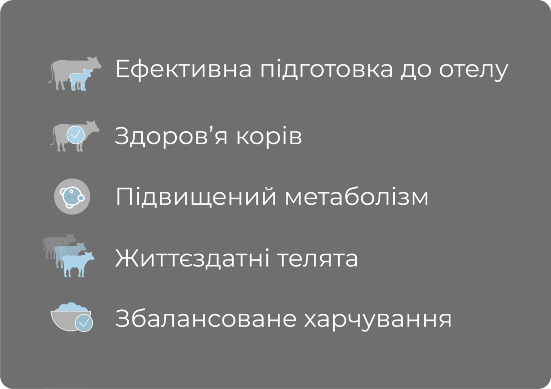 • Здоров’я корів: Зменшує випадки кетозу, метритів та маститів, забезпечуючи фізіологічне відокремлення посліду.