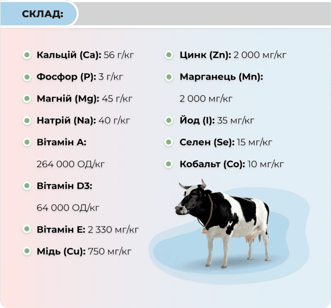 • Збалансоване харчування: Продукт задовольняє добову потребу тварин у макро- та мікроелементах та вітамінах. В останні місяці тільності плід зростає на 80%, збільшується матка, плацента, залозиста тканина вим’я. Якщо у раціоні корови не буде достатньо мінеральних речовин, вони будуть вимиватися з організму матері на користь плода. Купуйте премікс для дійних корів в період сухостою «Сухостій КДС» по цінам від виробника і забезпечте корів збалансованим харчуванням.