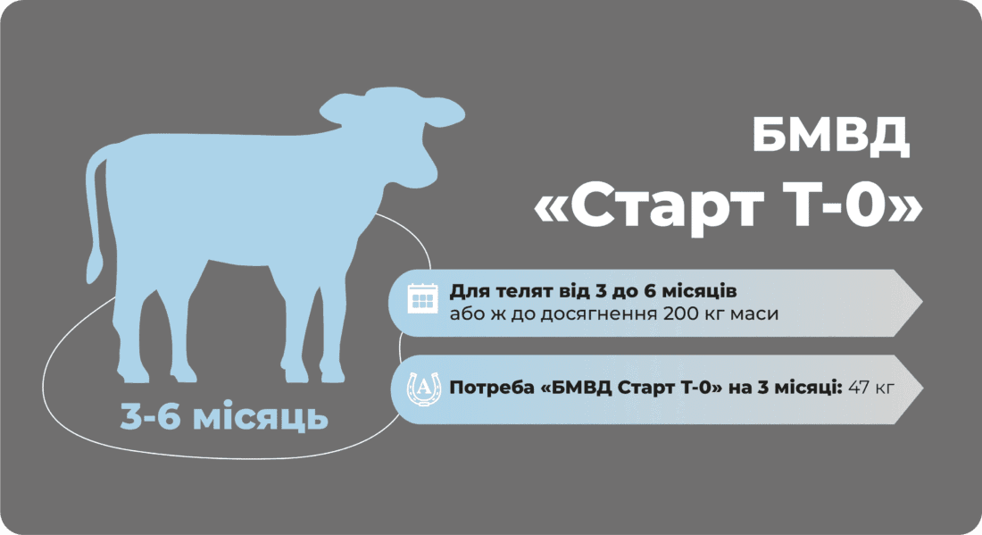 Післямолочний період – надзвичайно важливий у технологічному процесі вирощування телят, адже основне його завдання – отримати максимальний середньодобовий приріст. Саме в цей період, згодовуючи комбікорм, приготовлений на основі БМВД «Старт Т-О» у поєданні із збалансованою зерновою групою, можна досягти максимальних середньодобових приростів телят. Перехід від одного раціону до іншого необхідно проводити протягом 2-3 днів, змінюючи структуру годівлі.
