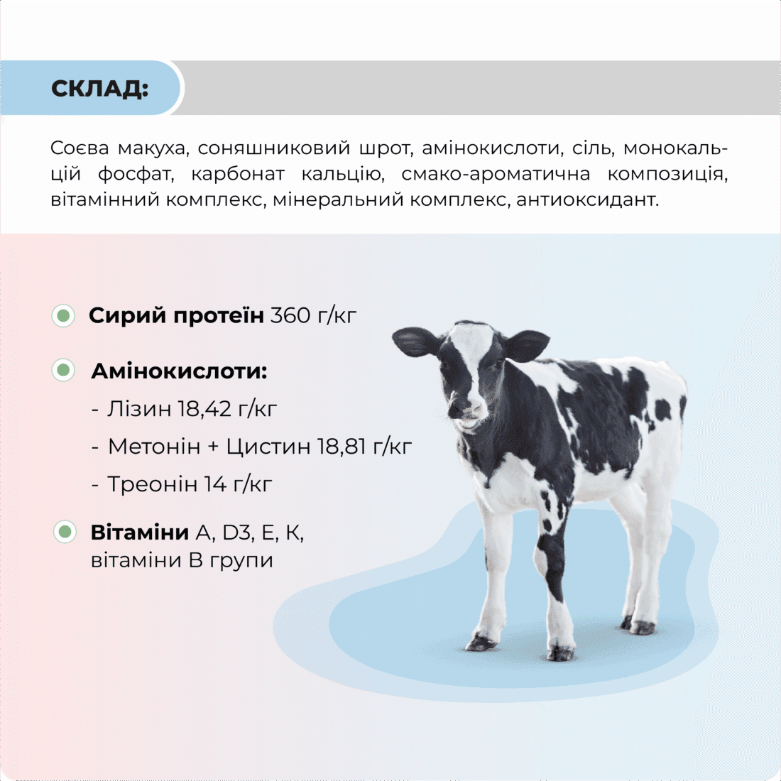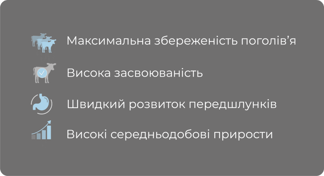• Швидкий розвиток передшлунків: Заселення нормальною мікрофлорою рубця, що забезпечує повноцінний та збалансований комбікорм.