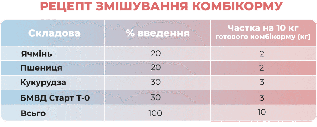 Для приготування готового комбікорму необхідно змішати БМВД «Старт Т-О» з зерновою групою у наступних пропорціях: Кукурудза: 30% Ячмінь: 20% Пшениця: 20% БМВД «Старт Т-О»: 30%