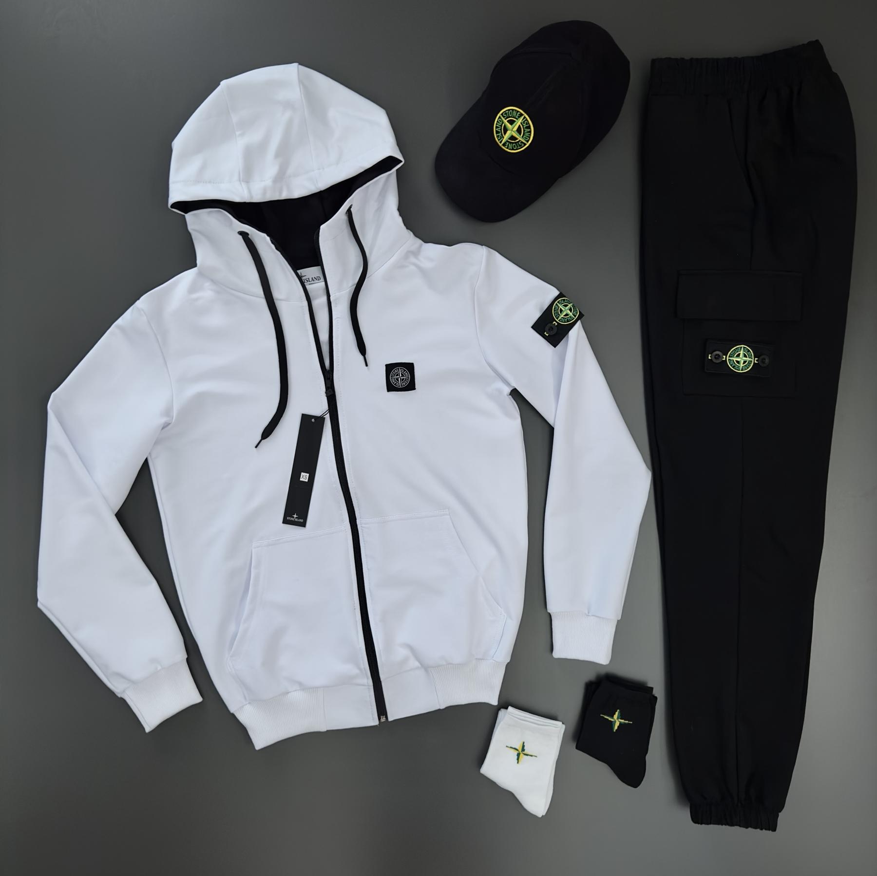 костюм мужской белый с черным сопом худи штаны кепка 2 пары носки Stone Island