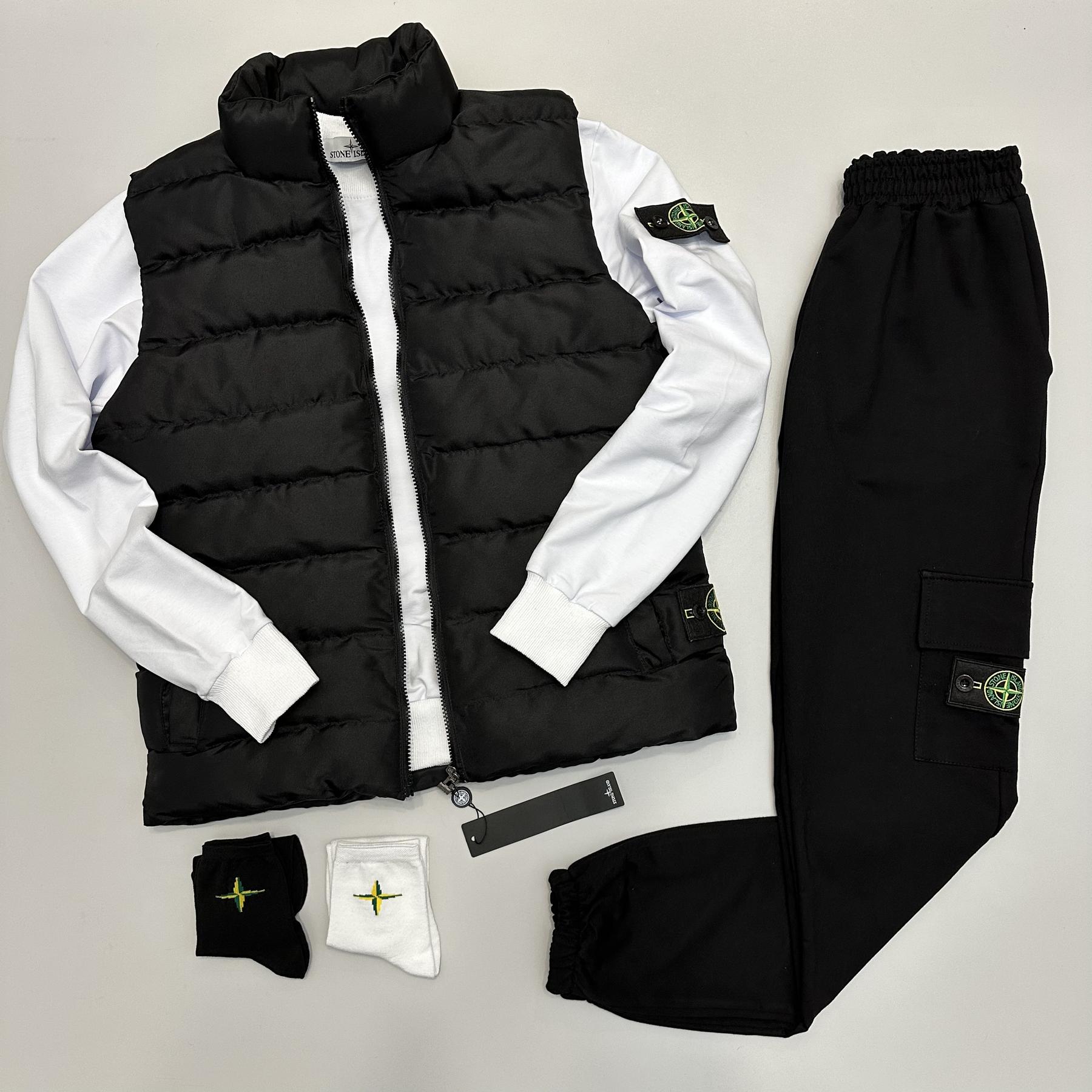 Набор Stone Island включает в себя жилет, светшот, штаны и две пары носок, что делает его идеальным выбором для создания стильного спортивного образа.