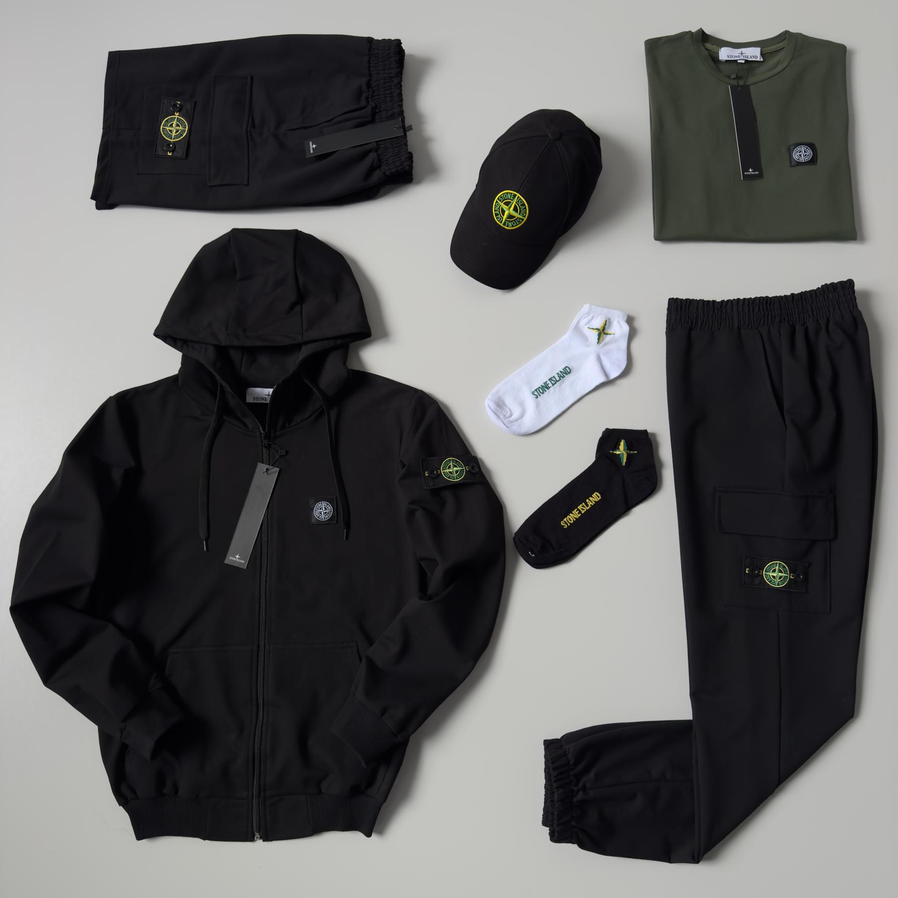 Набор 7в1 Stone Island включает в себя: худи, штаны, футболку, шорты, кепку и 2 пары носок.