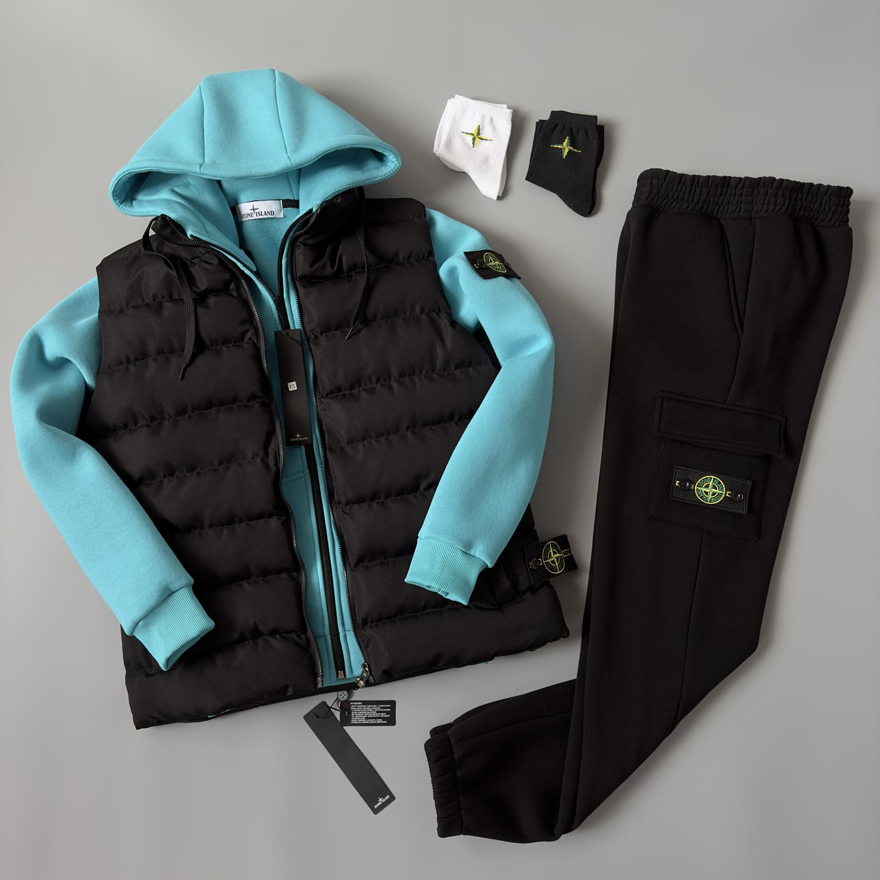 Зимний набор Stone Island включает жилет, худи, штаны и 2 пары носок в подарок.