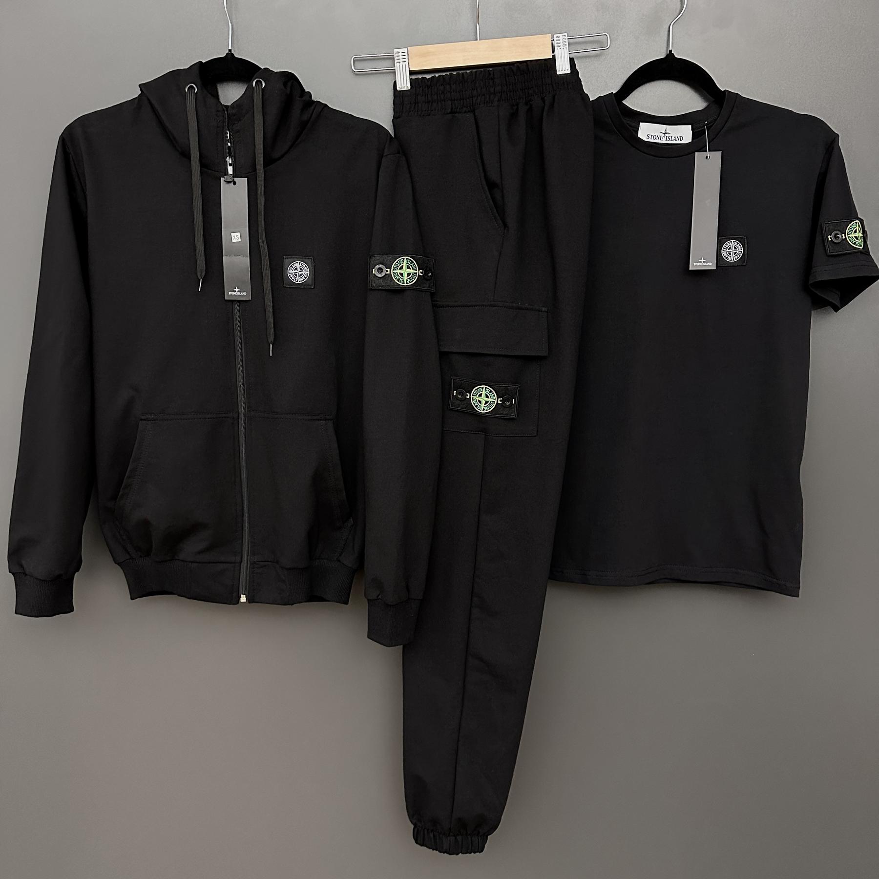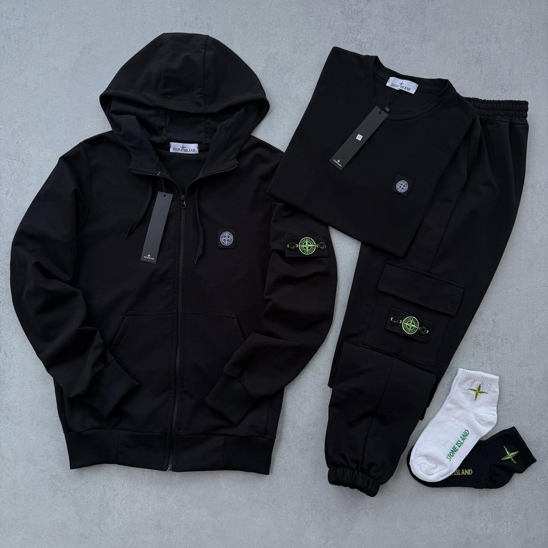 Stone Island черный зип худи, штаны и футболка – это стильный комплект унисекс, идеально подходящий для весны, лета и осени.
