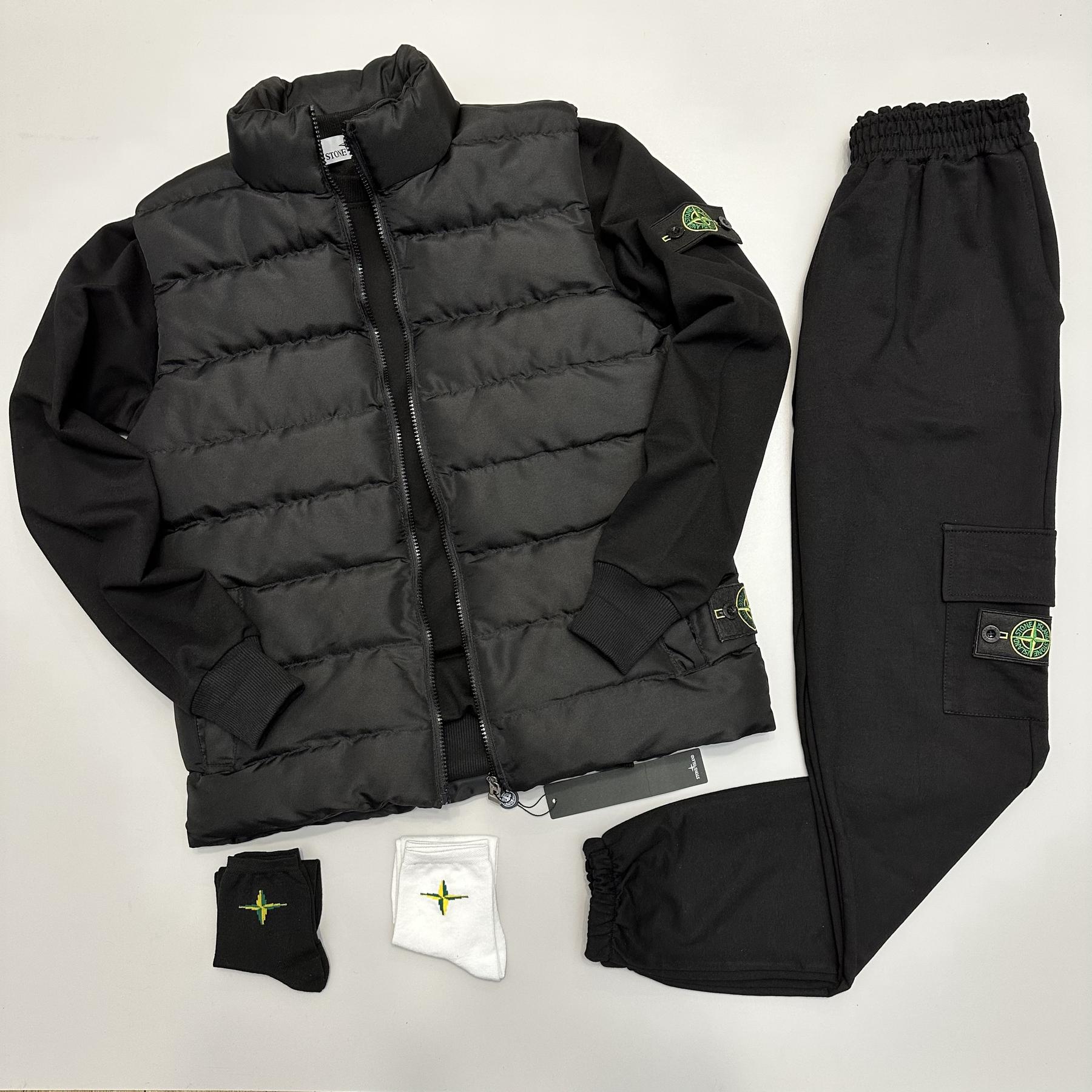 Набор Stone Island включает в себя жилет, свитшот, штаны и 2 пары носок, представляя собой стильную спортивную коллекцию мужской одежды.