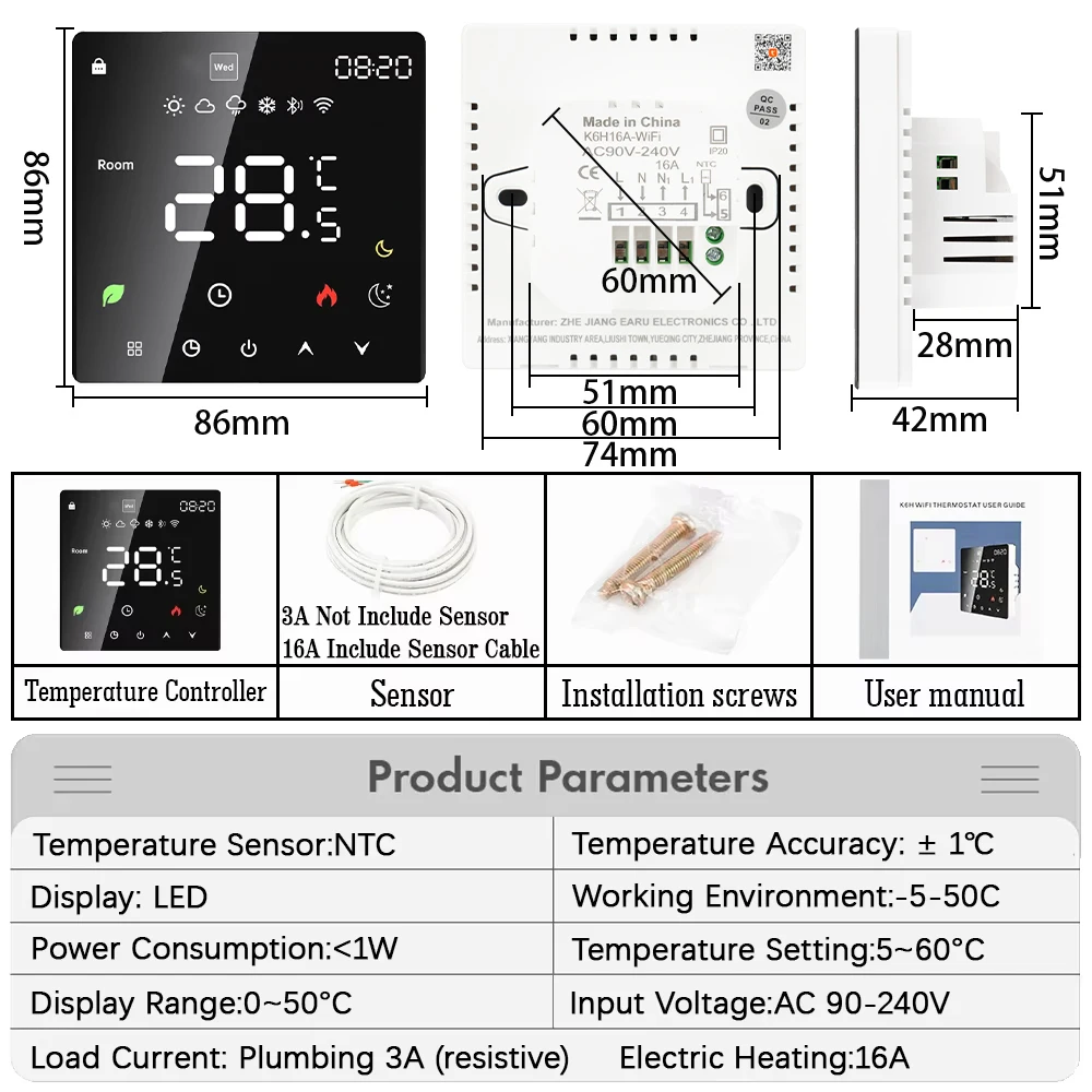 LED Термостат 230V 3А сенсорний дисплей, сумісний з Wi-Fi Tuya / Smart Life Белый
