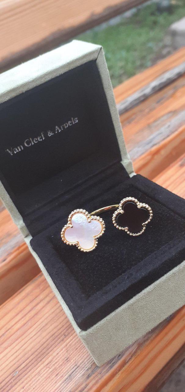 | Женское кольцо ван клиф брендовое золотистое оникс с перламутром клевер 2 цветка универсальное с регуляцией размера Van Cleef |