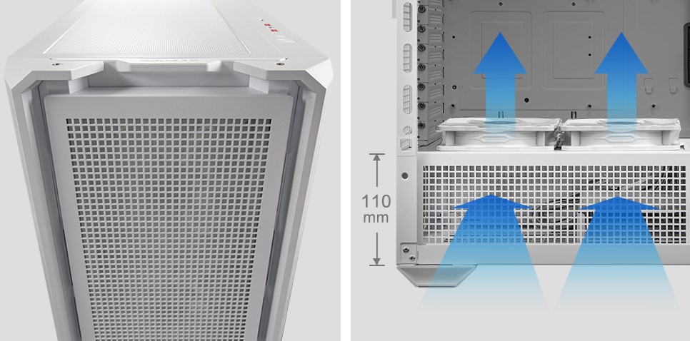 Попрощайтесь с горячим оборудованием: MX600 RGB защищен от повышения температуры благодаря полной всенаправленной вентиляции. Перфорированная передняя сетка и увеличенная высота отсека для блока питания с воздухозаборными отверстиями способствует эффективной проходимости воздуха.