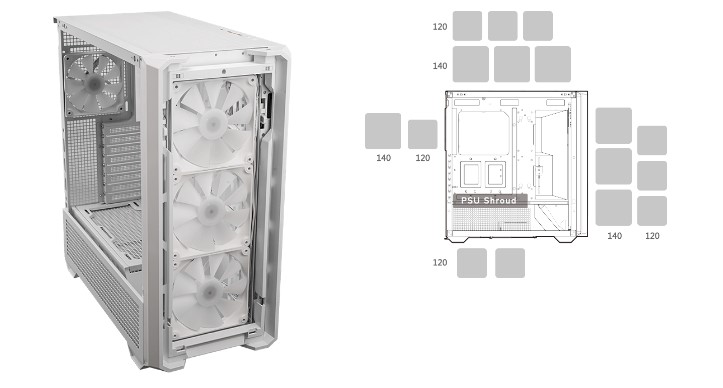 Конструкция планки передних вентиляторов упрощает сборку, позволяя устанавливать передние вентиляторы или водяное охлаждение без снятия передней панели. Полностью съемная верхняя крышка обеспечивает достаточно места для компонентов системы, а легкосъемная крышка отсека блока питания позволяет без проблем устанавливать или заменять блок питания. Вентиляторы или 360-мм систему водяного охлаждения можно надежно установить непосредственно на верхнюю крышку.