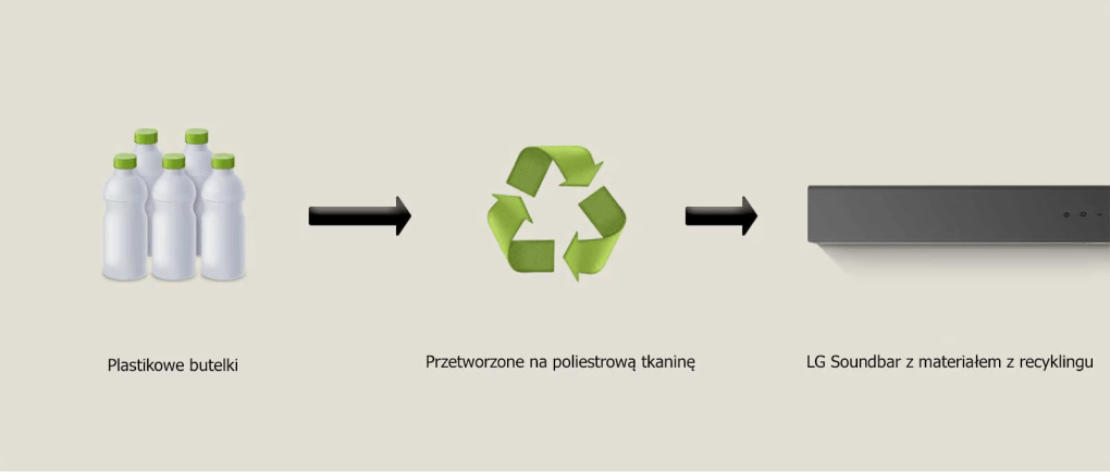 Розробляючи звукові панелі LG, ми дбаємо про використання якомога більшої кількості перероблених матеріалів. Сертифікат Global Recycled Standard підтверджує, що матеріалом, який ми використовуємо, є поліестеровий трикотаж, виготовлений із пластикових пляшок.
