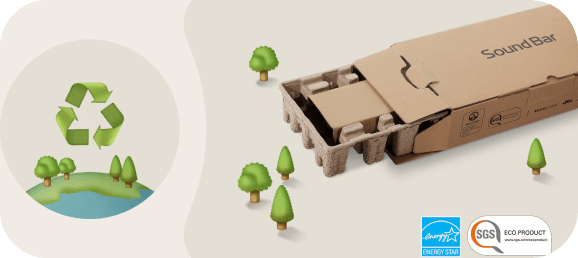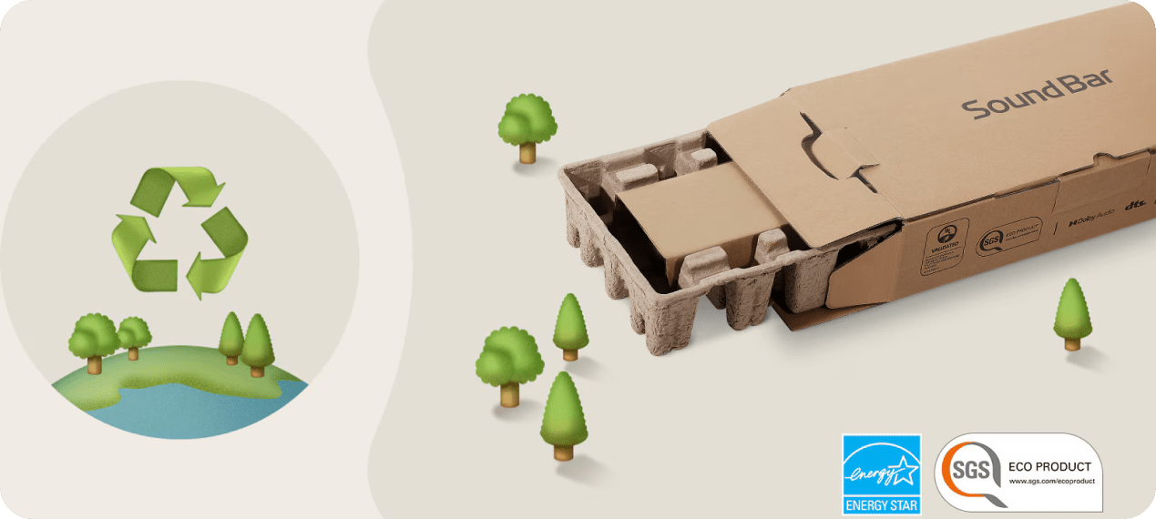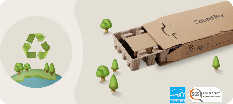 LG Soundbar отримала екологічний сертифікат SGS, перейшовши на внутрішню упаковку з переробленої формованої целюлози замість EPS (пінополістиролу) і пластикових пакетів. Це рішення є екологічно чистим, водночас забезпечуючи однаково ефективний захист продукту.