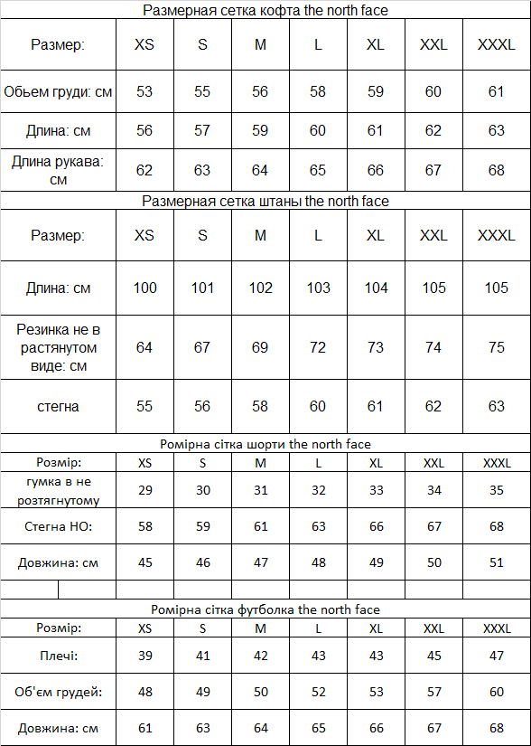 - Костюм и футболка: XS, S, M, L, XL, XXL, XXXL