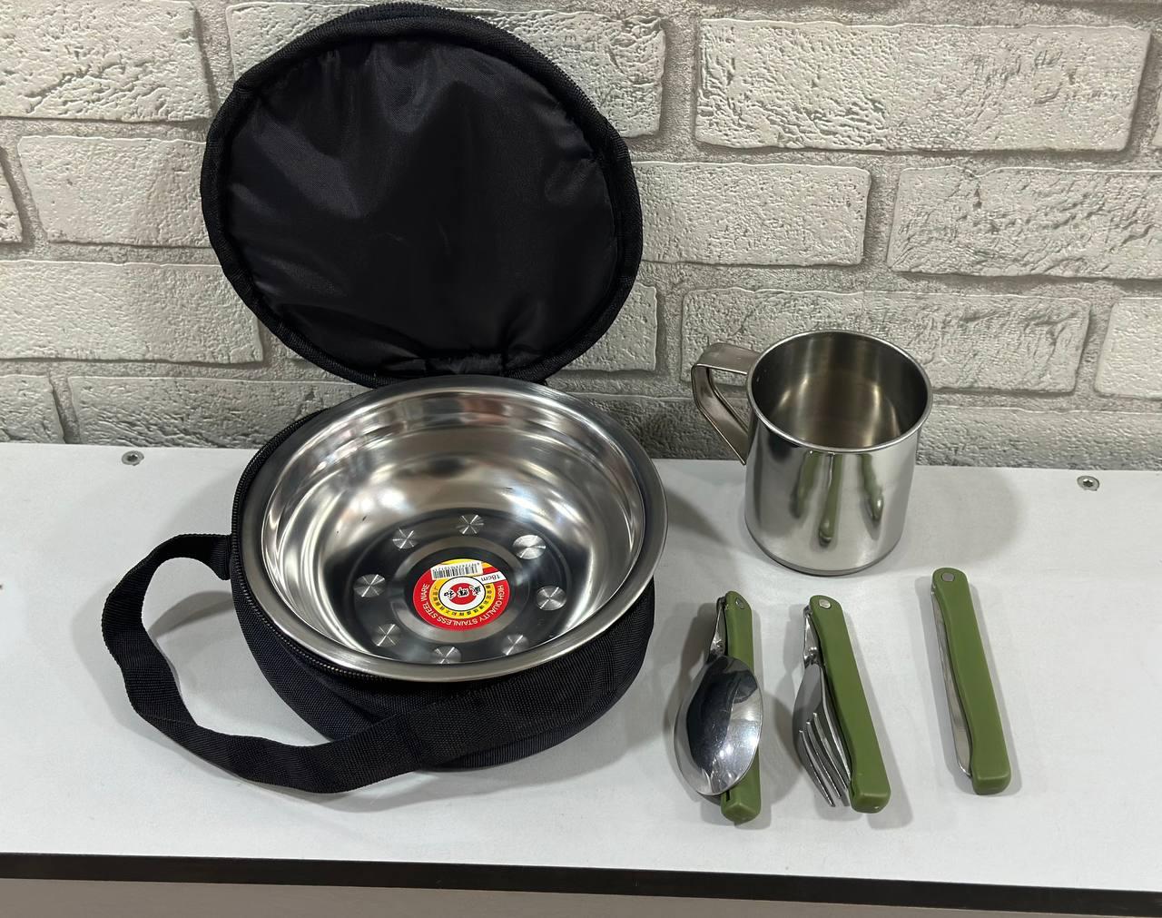 Комплект посуды для одного человека складные приборы Олива + сумка Черная нержавеющая сталь - миска ложк CI-88