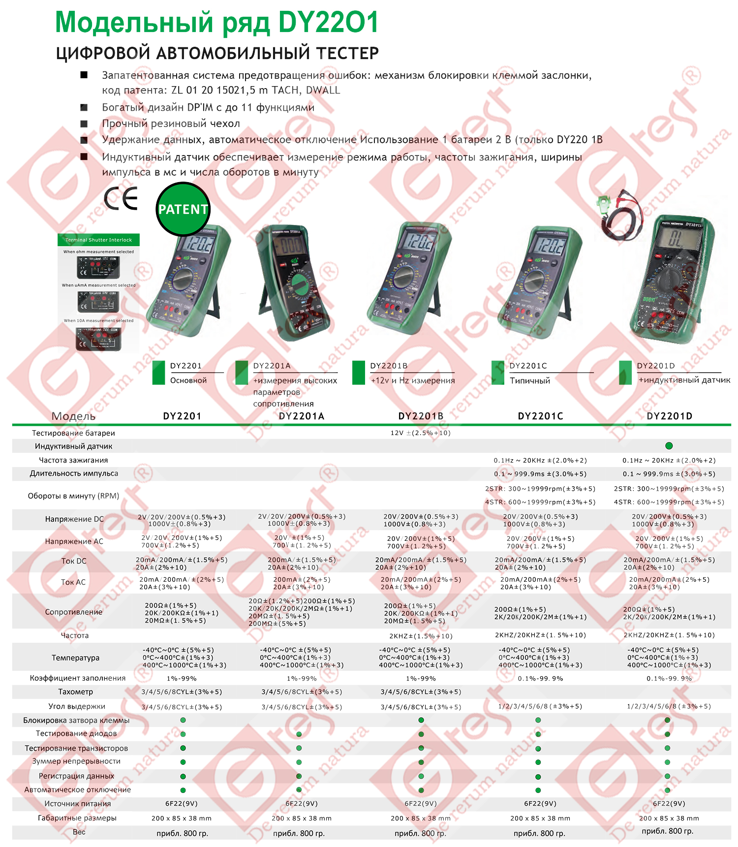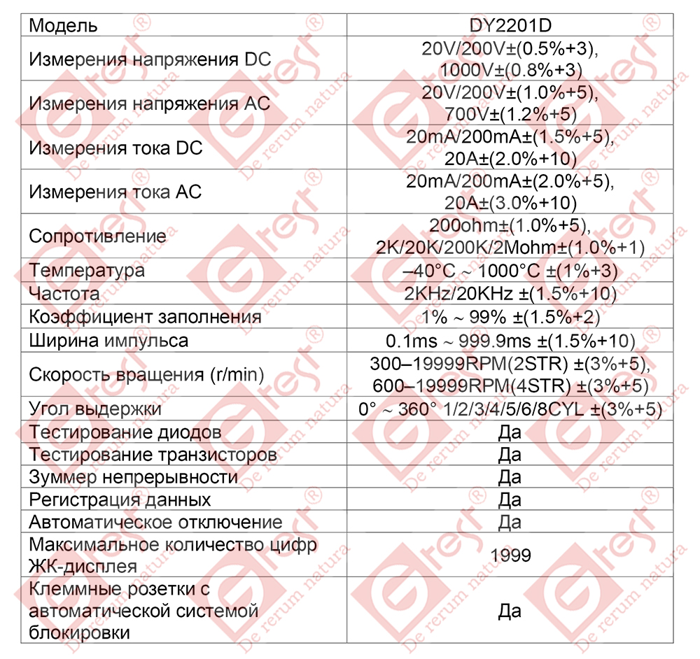 Технические характеристики цифрового автомобильного мультиметра с ЖК-дисплеем DUOYI DY2201D: