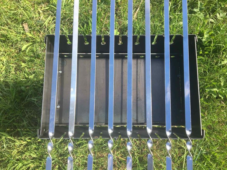 Наши мангалы предусмотрены для 6, 8, 10 или 12 шампуров, на выбор заказчика. Дополнительно предлагаем купить чехол для хранения и удобной транспортировки, а также кочергу для переворачивания горячих углей.