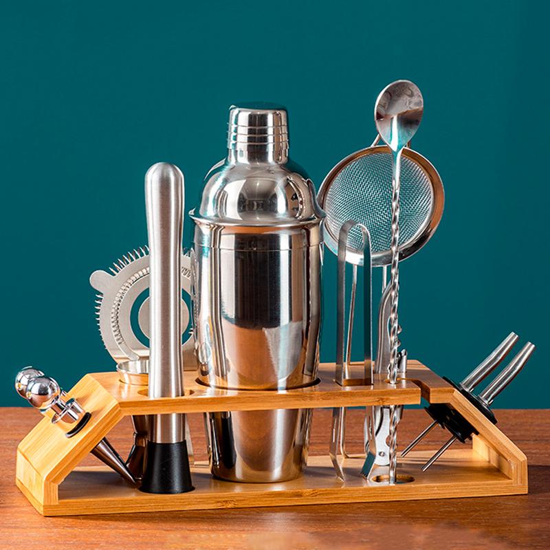 - Состав набора: Шейкер; Мадлер; Сито; Ложка барная; Стрейнер; Джиггер; Щипцы; Открывалка-штопор; Гейзер (2 шт); Пробка (2 шт); Подставка