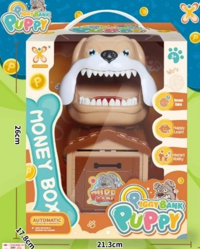 Особенность этой копилки заключается в её функционале, привлекает внимание необычайно ярким дизайном, имитирует звуки животных, играет мелодии и воспроизводит звуки музыкальных инструментов. На домике установлен персональный банкомат с паролем, а зубки злого пёсика – это цифровая клавиатура. Для надежности добавлена игровая пластина для отпечатка пальца. Банкомат подходит для мелочи и для купюр. Копилка оснащена кодовым замком, если не правильно ввести код, то пес укусит за палец. Данная функция очень нравится взрослым и радует деток. Сейф-копилка имеет привлекательный внешний вид, подходит для мальчиков и девочек в подарок.