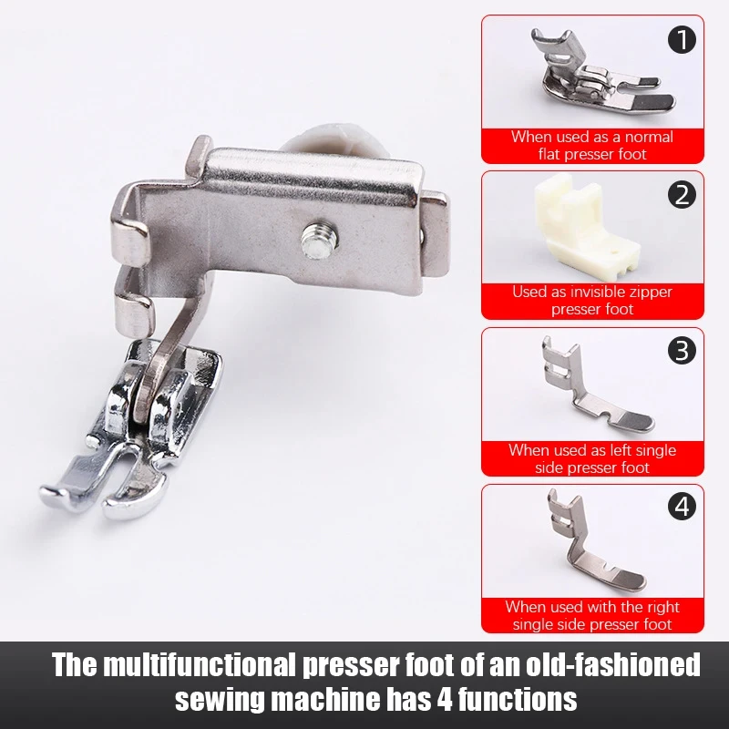 Прижимная лапка выполняет четыре функции: обычная прижимная лапка, прижимная лапка с невидимой молнией, левая и правая односторонняя прижимная лапка.