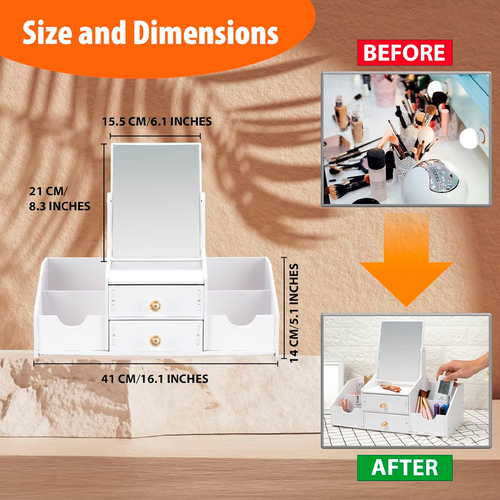 Органайзер с зеркалом для косметики — это идеальное решение для аккуратного хранения различных мелочей. Он отлично подходит для косметики, украшений, канцелярских принадлежностей, ключей и других необходимых вещей. Благодаря элегантному дизайну и удобному зеркалу, которое вращается на 360°, он гармонично впишется в интерьер любой комнаты. Встроенный выдвижной ящик обеспечивает достаточно места для хранения, а простая разборка и сборка делают его незаменимым помощником как для детей, так и для взрослых. Этот органайзер станет прекрасным подарком для ваших близких — дочерей, сестер или подруг.