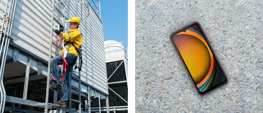Пристрій Galaxy XCover7, що перебуває у вертикальному положенні, демонструє задню частину, накладаючись на передню частину іншого пристрою XCover7 з барвистими шпалерами на екрані.