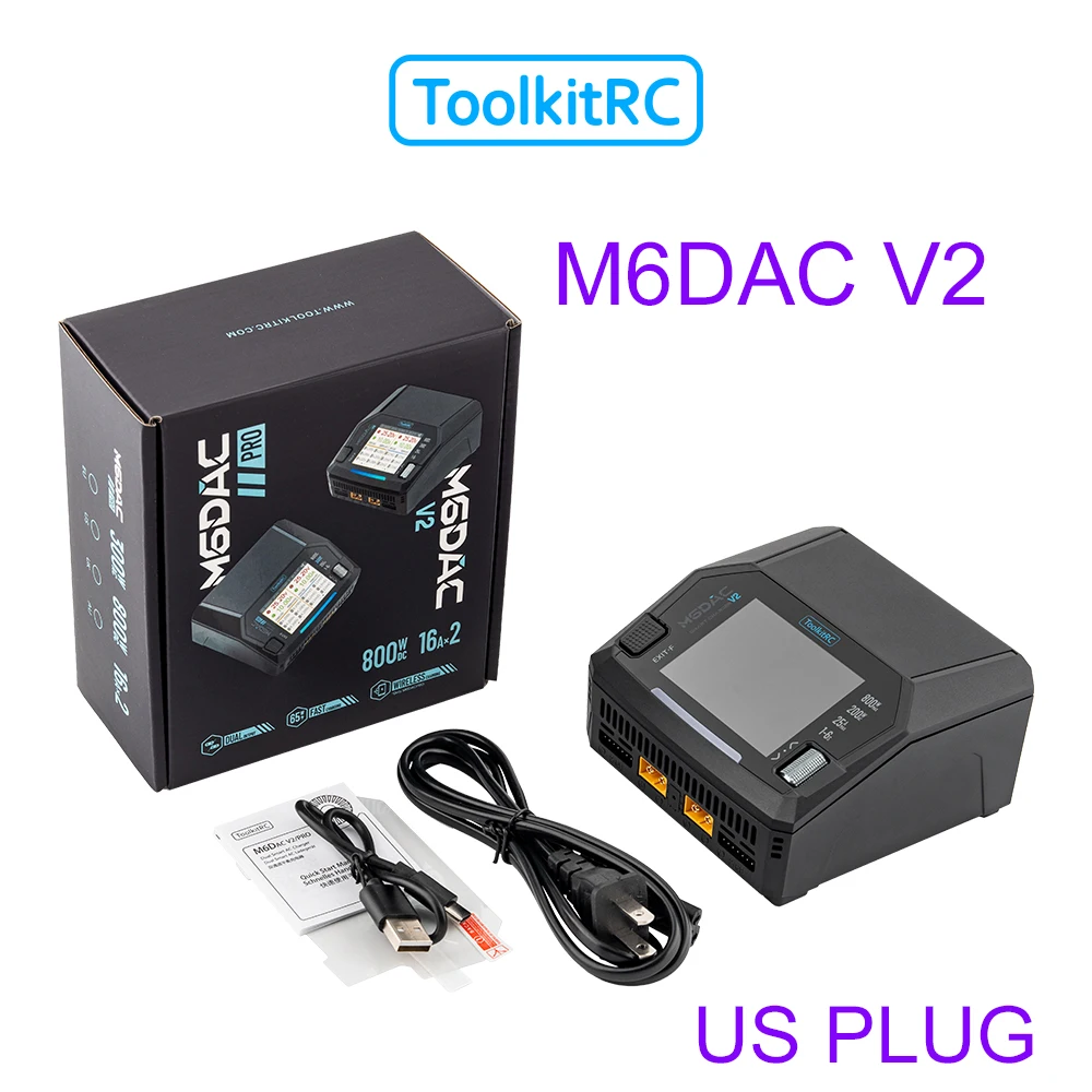 ToolkitRC M6DAC V2- универсальное двухканальное зарядное устройство с встроенным блоком питания на 200 Вт и суммарной мощностью заряда до 700 Вт (максимальной мощностью 400 Вт на каждый канал) с током заряда до 28А. Это современное двухканальное зарядное устройство ToolkitRC M6DAC V2 со встроенным блоком питания мощностью на 200 Вт. Питается от сети 220-230В или от источника постоянного тока (блока питания) или внешнего аккумулятора 7-28В
