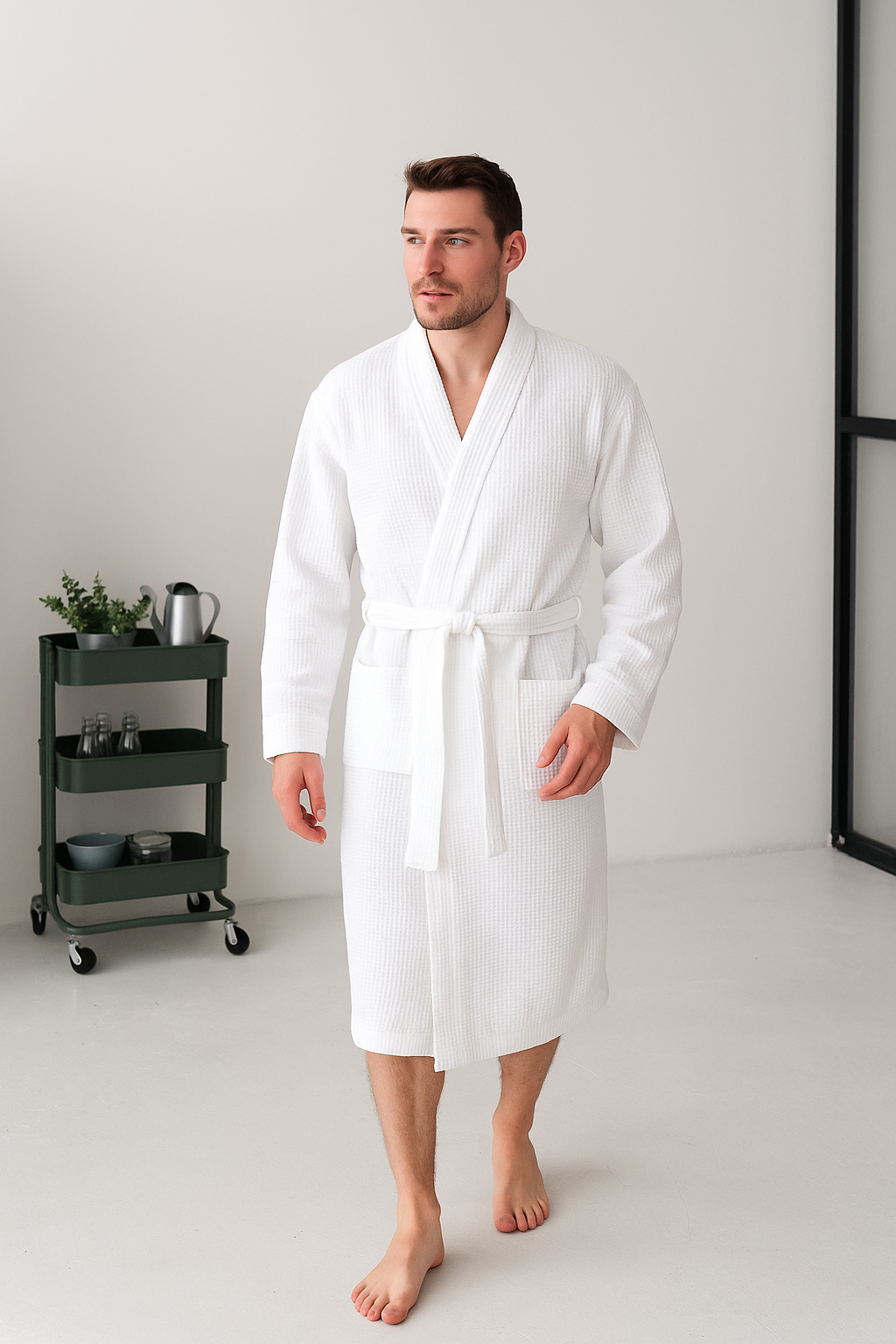 Чоловічий білий вафельний халат- практичний і стильний вибір для чоловіків, які цінують комфорт і якість. Легкий вафельний халат стане незамінним після душу, ванни, тренування, відвідування бані чи сауни. Завдяки унікальній структурі тканини він чудово вбирає вологу, даруючи відчуття свіжості й зручності.