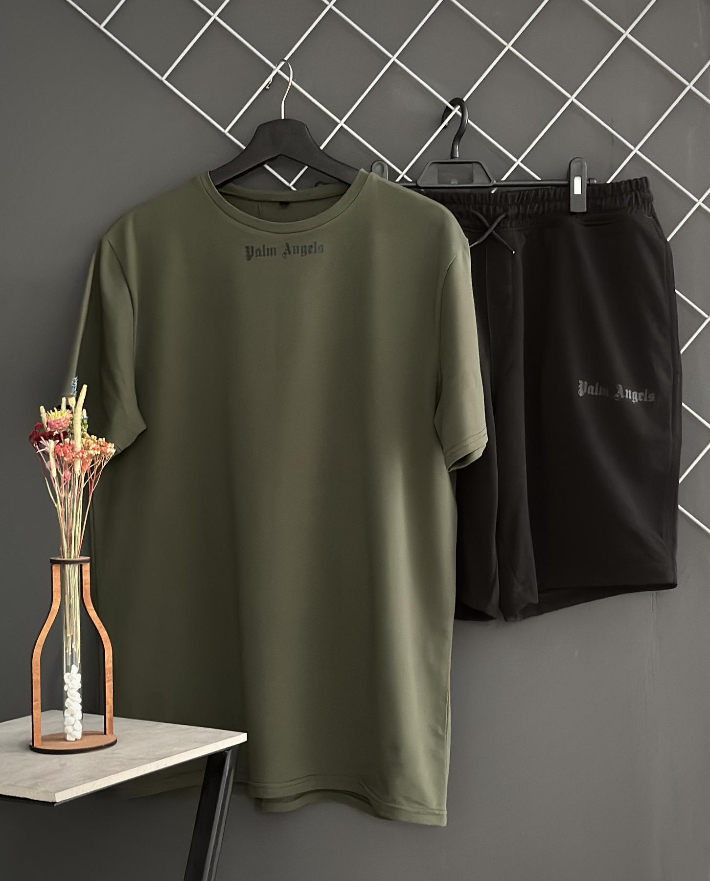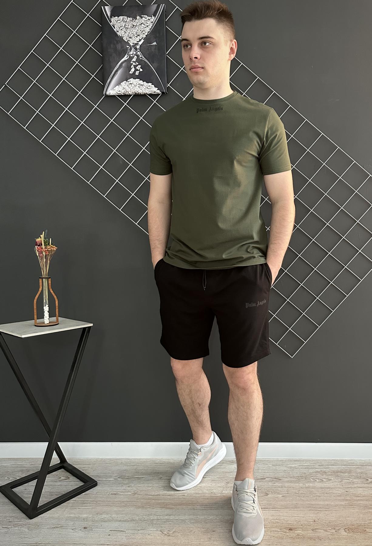 Комплект состоит из шорта черного цвета с логотипом Palm Angels и футболки хаки, что делает его идеальным выбором для тех, кто хочет выглядеть стильно и чувствовать себя комфортно. Футболка изготовлена из 100% хлопка, что обеспечивает приятные ощущения на коже, а стрейч-коттон позволяет свободно двигаться.