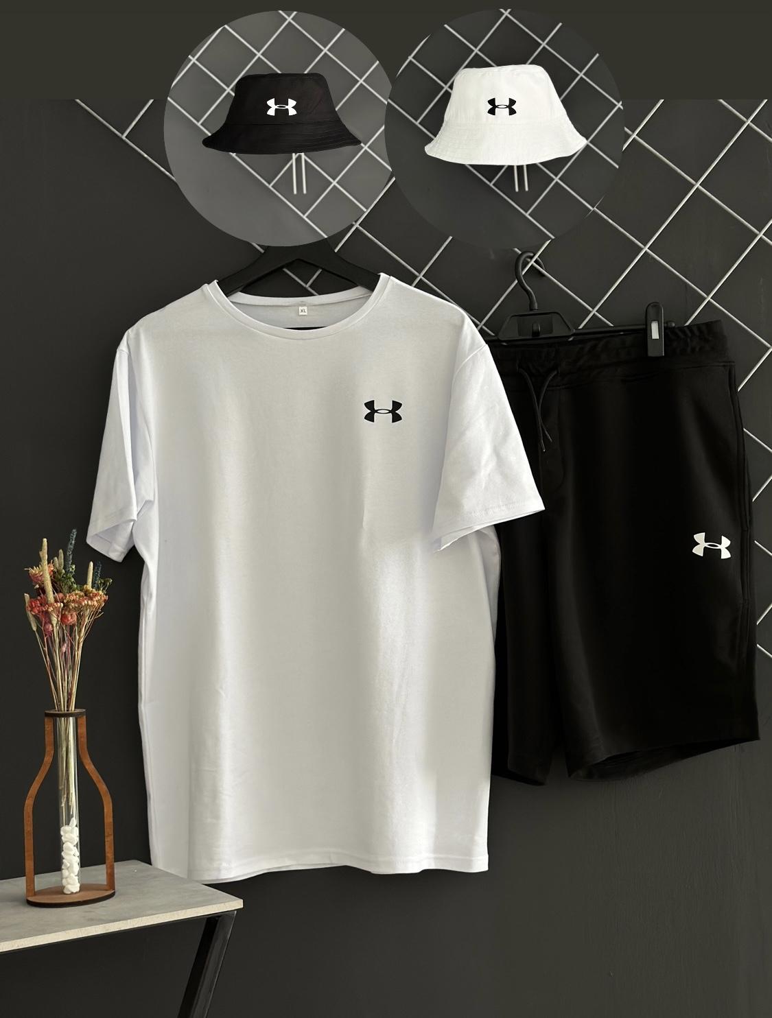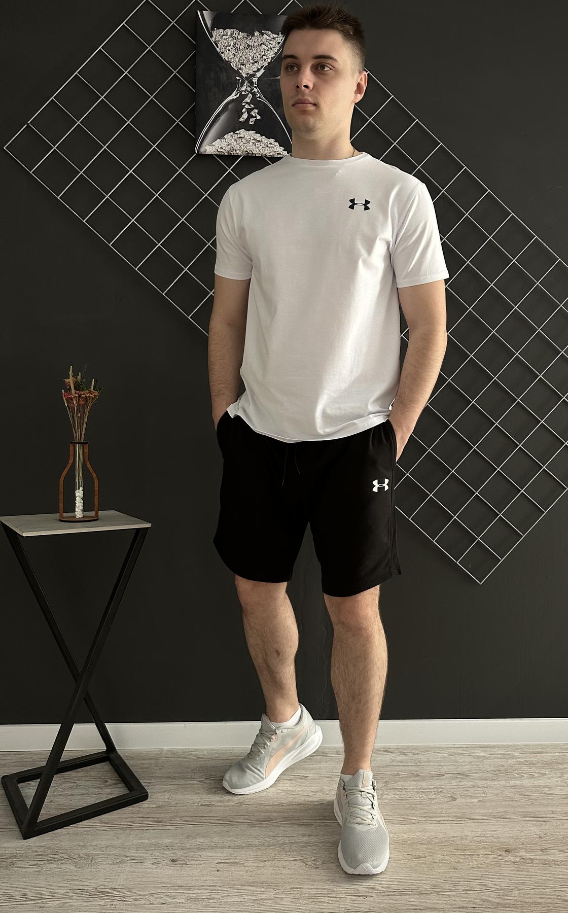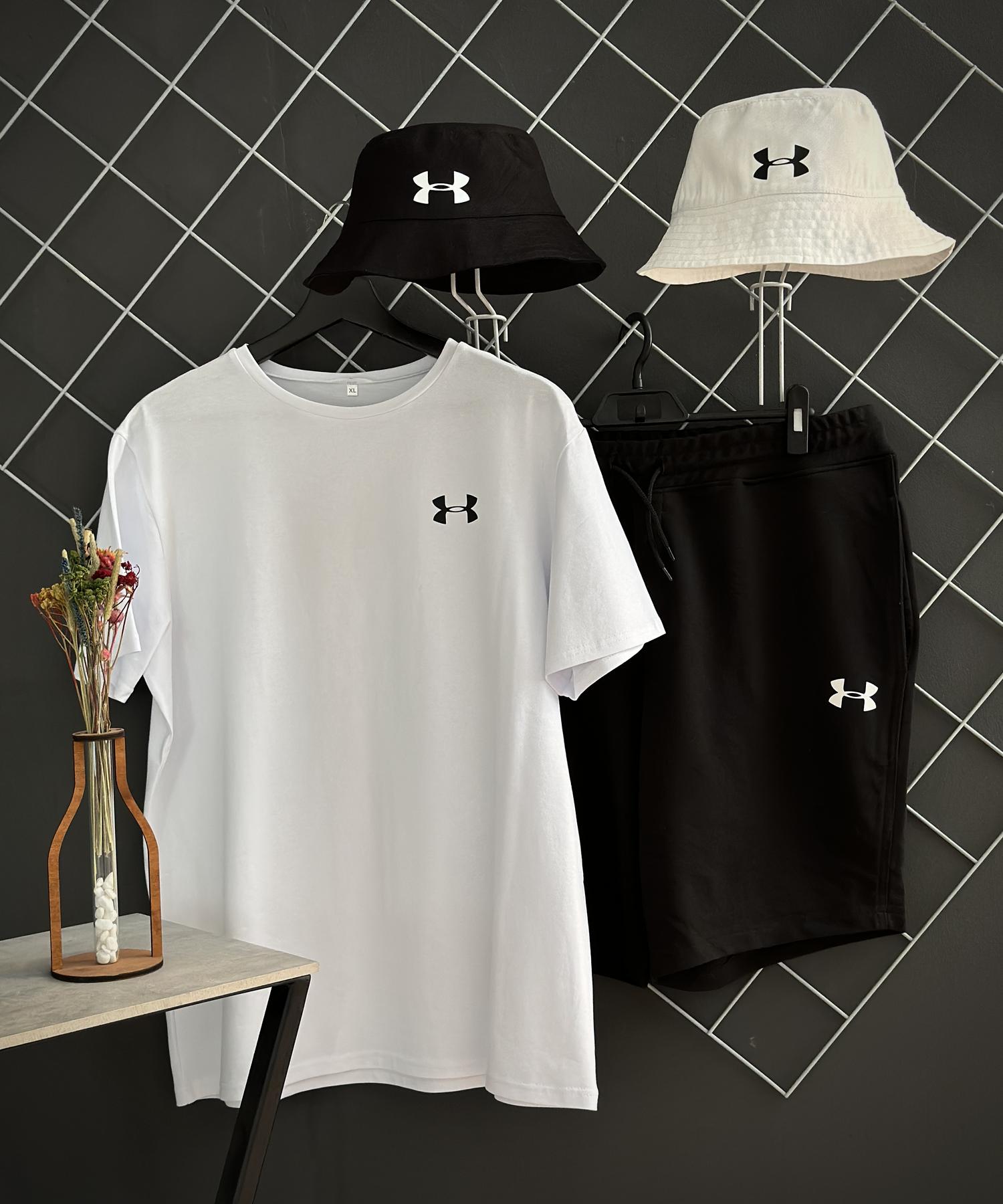 Этот комплект состоит из черных шорт, белой футболки и паны Under Armour, что делает его идеальным выбором для активного отдыха летом. Шорты изготовлены из двунити, что обеспечивает удобство и легкость, а также имеют регулируемый пояс на шнурке, что позволяет настроить посадку под ваши нужды.