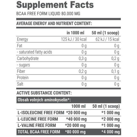 Наш продукт BCAA в свободной форме жидкость 80000 мгсодержит оптимальное соотношение аминокислот с разветвленной цепью 2: 1: 1 - вдвое больше лейцина, чем изолейцина и валина. Почему 2: 1: 1? Лейцин считается самым важным из BCAA для мышечных процессов во время и после тренировки. Тем не менее, необходимо получить все три BCAA. Соотношение 2: 1: 1 соответствует физиологическим потребностям отдельных BCAA и обеспечивает их максимальный эффект. При более высоких дозах лейцина его нельзя использовать больше, поскольку применяется закон предельной аминокислоты Рубнера (использование аминокислот из принятых белков зависит от содержания наименее представленной незаменимой аминокислоты) и закон Вольфа о незаменимых аминокислотах (потребление любой незаменимой аминокислоты нарушает метаболизм других аминокислот). и усиливает предельные аминокислотные проявления).