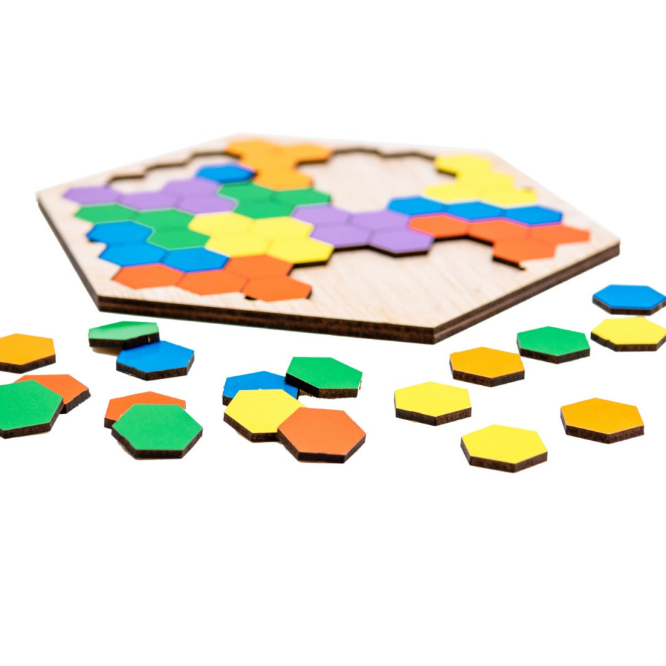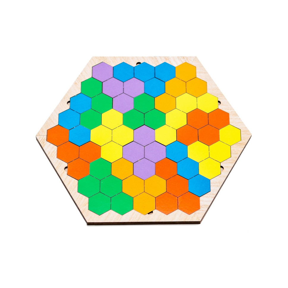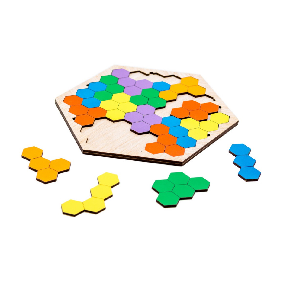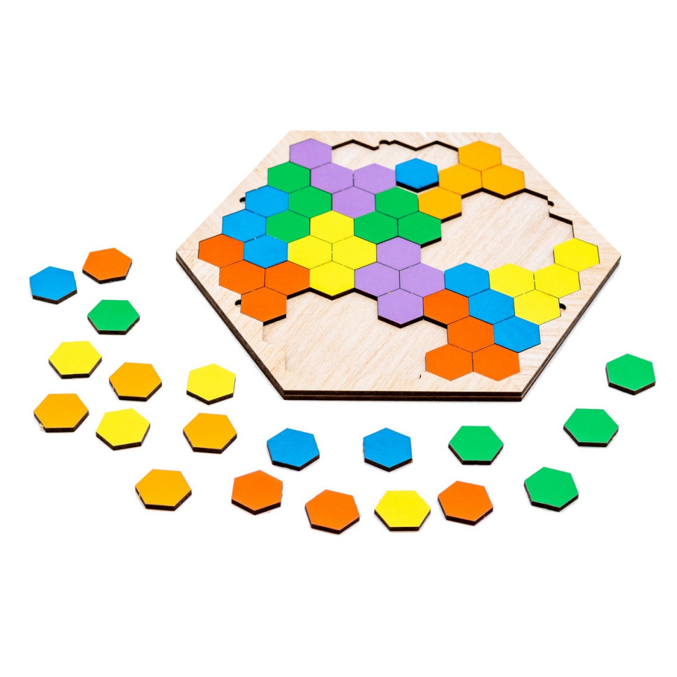 Дерев'яна гра-пазл "Шестикутник" приваблює простотою та можливістю цікаво проводити час з дитиною. Комплект включає дерев'яний планшет та 20 різнокольорових деталей у формі шестикутників, які можна вкладати в різному порядку. Складайте разом з дитиною візерунки, комбінуйте фігурки на свій розсуд, змагайтеся на швидкість. Проста гра водночас дає багато можливостей для розвитку логічного та просторового мислення.