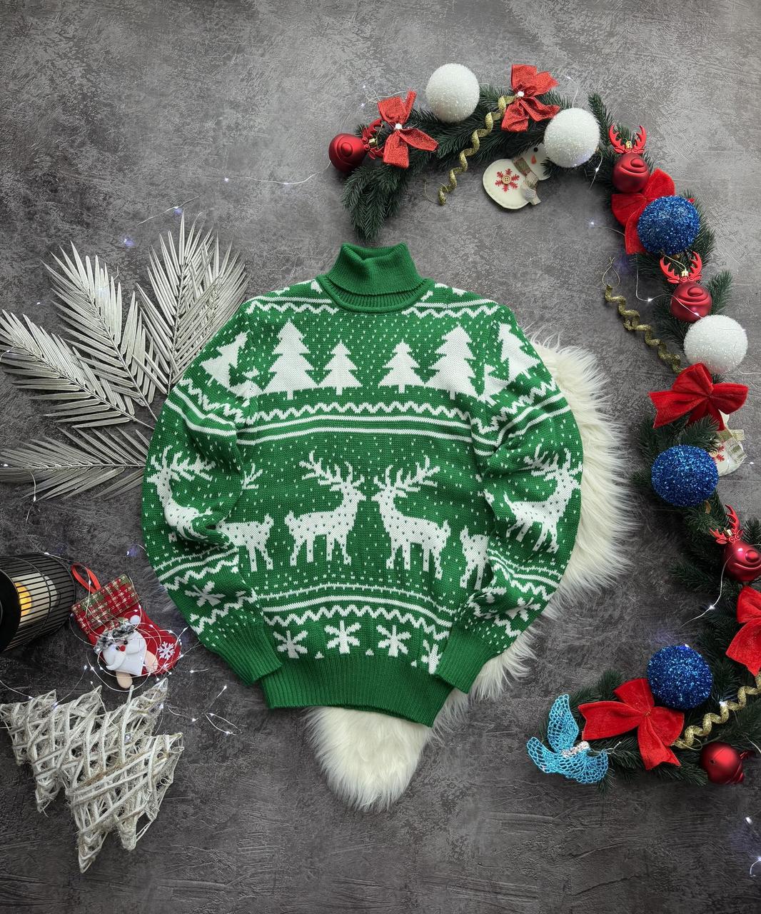 Свитера новогодние для пары с оленями и елочками с горлом теплый вязаный Рождественский гольф унисекс на подарок