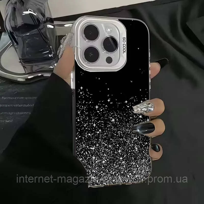 Стильный чехол Звездное небо - идеальный аксессуар для тех, кто любит блеск и эстетику. Черная основа с градиентом белых блесток создает эффект звездного неба, а надпись добавляет характера. Надежная защита для камеры и корпуса, совместимая с моделями iPhone. Идеально сочетается с маникюром в гламурном стиле.