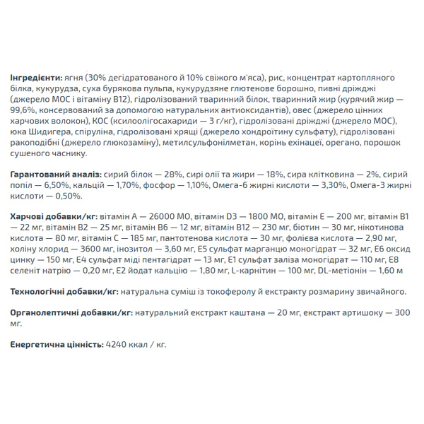Это полноценный сбалансированный рацион для щенков мелких пород. Оптимален для собак, склонных к аллергическим воспалительным реакциям. Ягненок и рис являются источниками легкоусвояемых белков и углеводов, поэтому этот рацион прекрасно подходит собакам с проблемами пищеварения. Содержимое X.O.S. помогает сохранить естественный баланс кишечной микрофлоры, способствует оптимальному усвоению питательных веществ и повышает иммунитет. Омега-3 и Омега-6 жирные кислоты оптимально сбалансированы в составе корма для поддержания кожи и шерсти в отличном состоянии. Комплекс лечебных трав и растений благоприятно влияет на растущего щенка. Богат биологически активными веществами и антиоксидантами, способствующими усилению защитных сил организма животного. Глюкозамин, хондроитин, кальций и фосфор для здоровья суставов. Эти вещества в составе корма способствуют формированию здоровой хрящевой ткани и развитию опорно-двигательного аппарата.