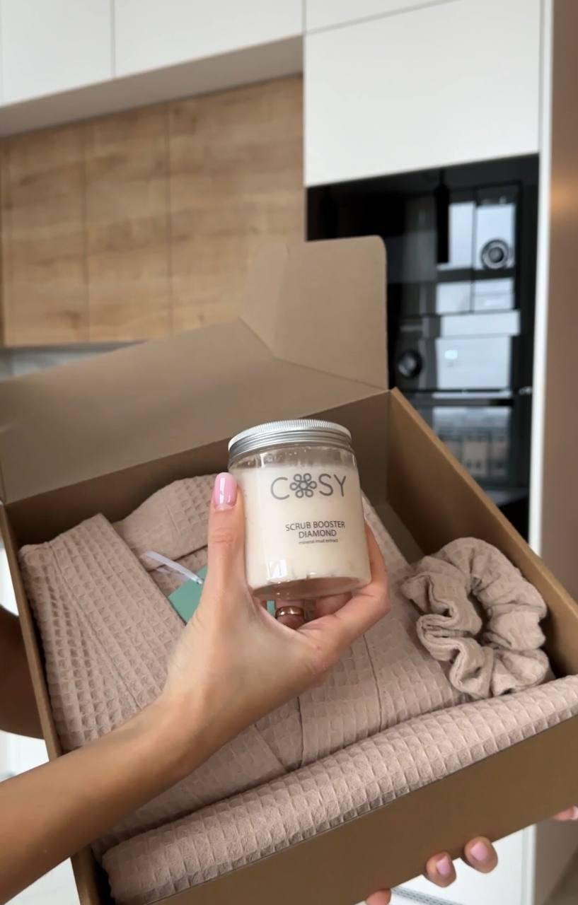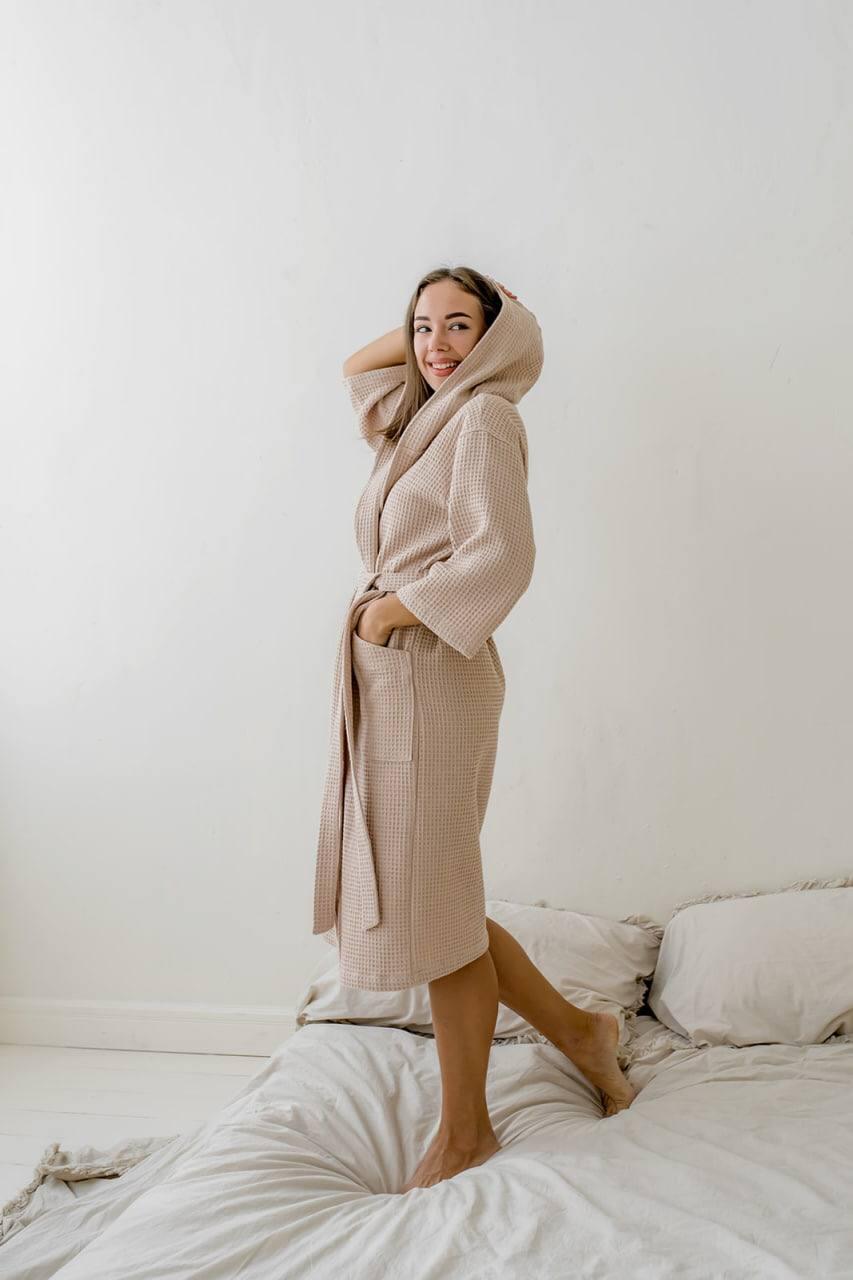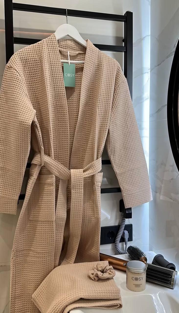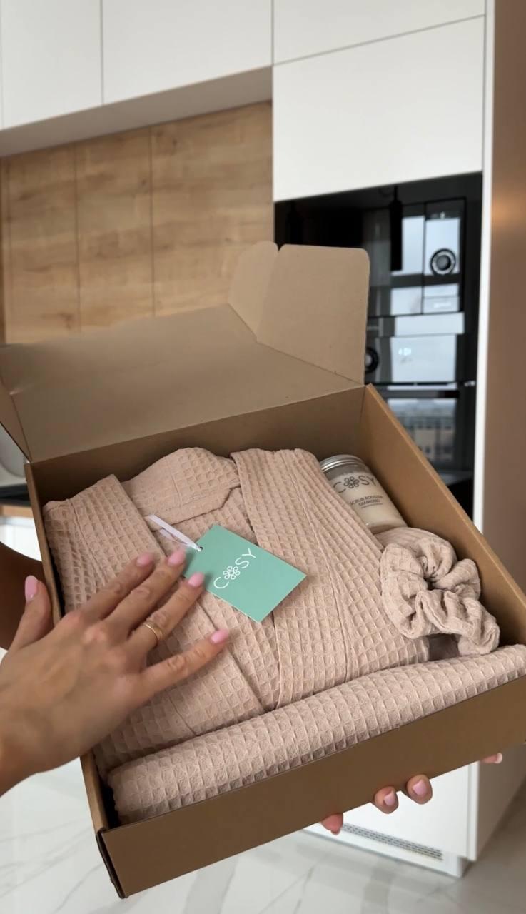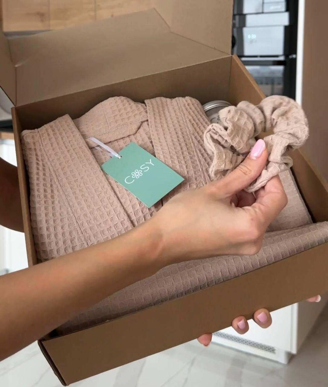 Жіночий Подарунковий набір з халатом в коробці: До складу набору входить: - халат з капюшоном - рушник 70*140 - резинка для волосся - парфумований скарб 450 г Колір: беж (warm sand) Завдяки своїй м'якості та унікальній здатності поглинати вологу вафельна тканина є однією з найпопулярніших серед бавовняних тканин. Вафельні халати добре обсушують тіло, не створюючи парникового ефекту. Тканина: 100% бавовна, Туреччина розміри: S; M; L; XL; 2XL;